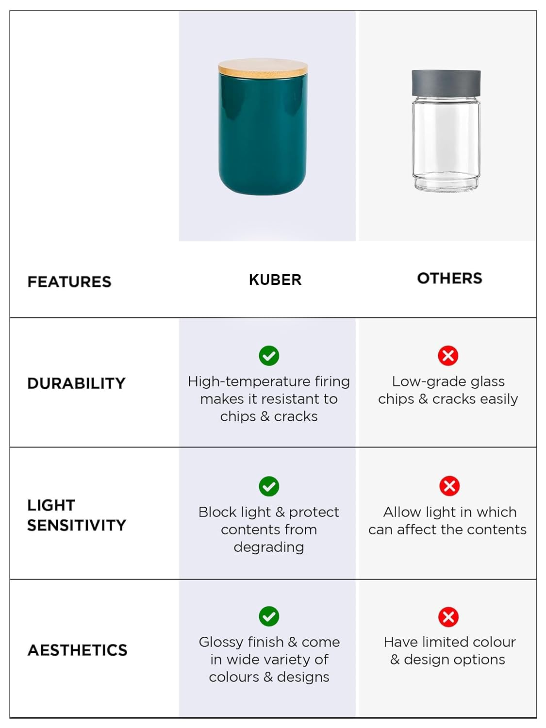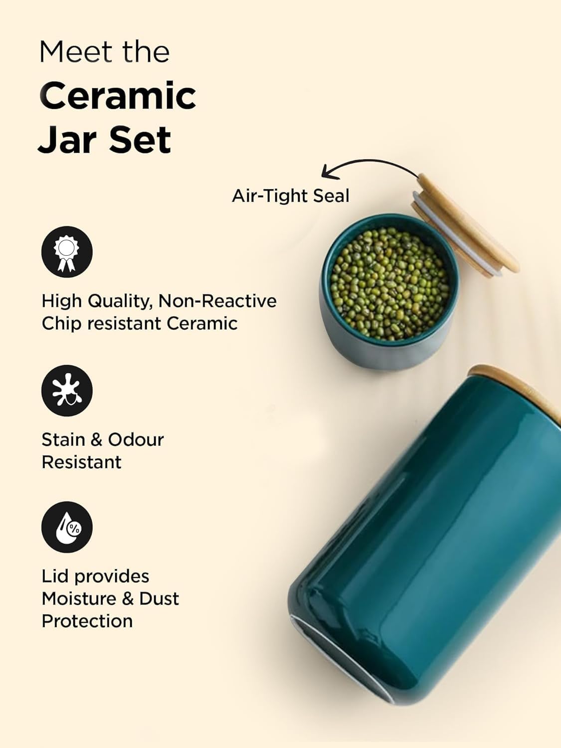 Welcome to the world of Homestic kitchen storage jars and containers, where high quality meets aesthetic appeal! Our Ceramic Jar with Bamboo Lid is the perfect solution for all your kitchen storage needs. Made from high quality ceramic material, this container is not only durable but also visually appealing with its glossy finish in a vibrant green color. The bamboo lid comes with a silicone ring to ensure an airtight seal, keeping your food items fresh for longer. The wide mouth design makes it easy to access your stored items, whether it's tea, coffee, snacks, pulses, grains, or dry fruits. This multipurpose container is also ideal for storing spices, sugar, salt, and even ghee. With a capacity of 800ml, this Homestic container is perfect for organizing your kitchen cabinets and keeping your pantry neat and tidy. The Homestic Ceramic Jar with Bamboo Lid is a must-have for mothers, families, and wives who value quality and durability in their kitchen storage solutions. Not only is this container BPA free and dust resistant, but it is also dishwasher safe for easy cleaning. The included components come as a combo set, making it a great gifting option for your loved ones. The elongated shape and green color make it a stylish addition to any kitchen decor. Customers love the high quality and aesthetically pleasing design of our Homestic Ceramic Jar with Bamboo Lid. They appreciate the value for money and the recommendation from others who have experienced the benefits of using this container. Our product successfully overcomes any lid or seal issues, ensuring that your kitchen storage needs are met with the utmost satisfaction. Experience the convenience and style of Homestic kitchen storage jars and containers today.Detailed Specifications:
