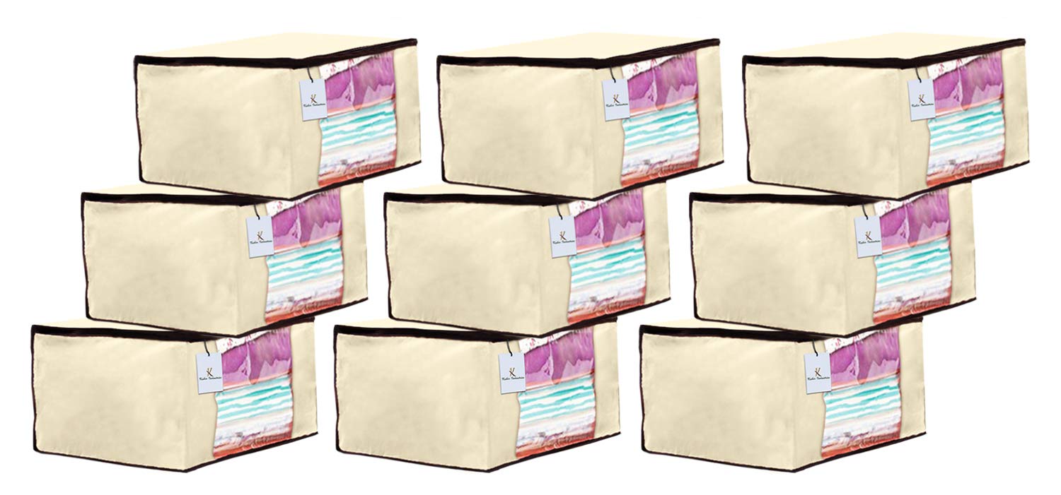 Made from durable, wear and tear-resistant non-woven fabric. Lightweight and flexible saree covers, carefully stitched to offer additional strength, size of each bag: 43 cm x 35 cm x 22 cm, transparent see-through window for easy identification of contents. Durable zipper for easy opening and closing, ideal for storing sarees and protecting them from dust and insects, package contents: 9 piece saree cover (color: Ivory).