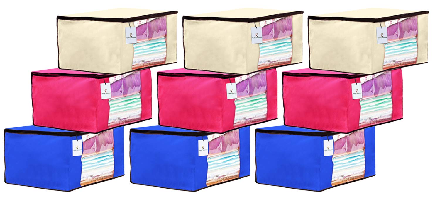 Made from durable, wear and tear-resistant non-woven fabric. Lightweight and flexible saree covers, carefully stitched to offer additional strength, size of each bag: 43 cm x 35 cm x 22 cm, transparent see-through window for easy identification of contents. Durable zipper for easy opening and closing, ideal for storing sarees and protecting them from dust and insects, package contents: 3 piece saree cover (color: Royal blue), 3 piece saree cover (color: Ivory), 3 piece saree cover (color: Pink).Detailed Specifications: