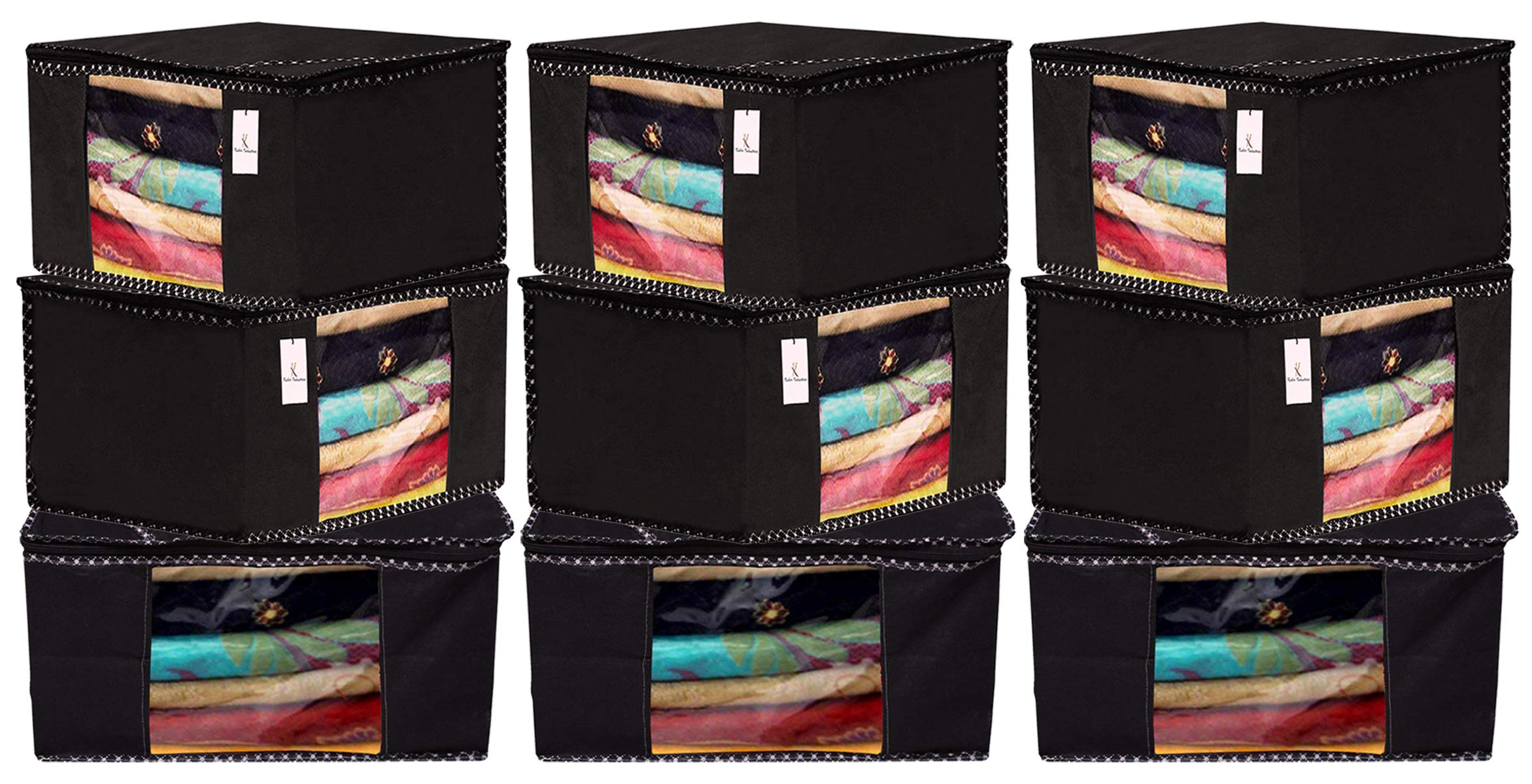 Material: Non Woven, Color: Black. .Package Contents: 9 Pieces Saree Cover .Size: 43 cm x 35 cm x 22 cm .Made from durable, wear and tear-resistant non-woven fabric. Lightweight and flexible saree covers .Carefully stitched to offer additional strength. Ideal for storing sarees and protecting them from dust and insects .Transparent see-through window for easy identification of contents. Durable zipper for easy opening and closingDetailed Specifications: