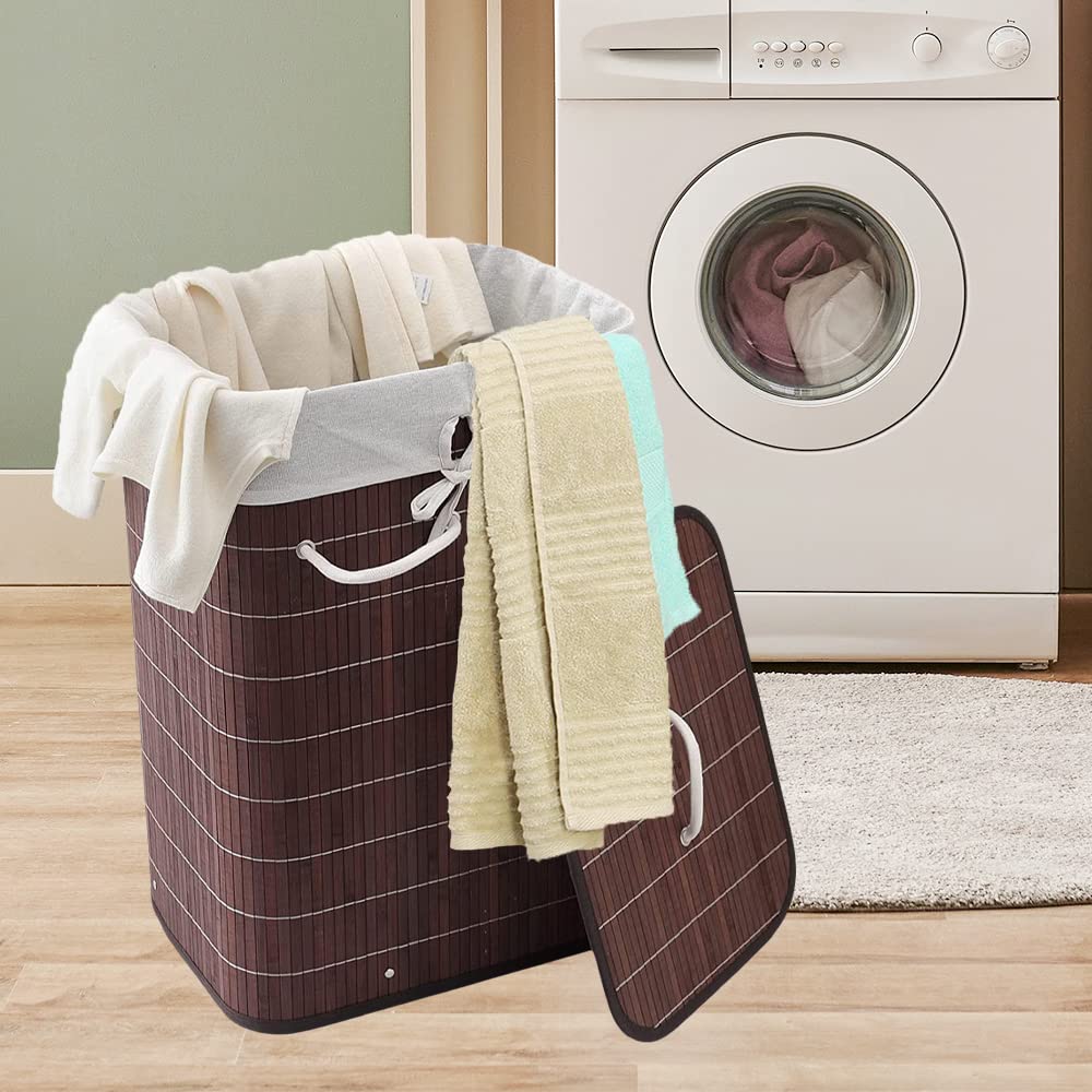 Kuber Industries laundry basket features a sturdy bamboo construction with a lid, offering a stylish and eco-friendly solution for organizing and concealing laundry items. Its bamboo material ensures durability and a natural aesthetic, while the included lid keeps contents hidden and neat. This laundry basket combines functionality and aesthetics for a practical addition to any home.