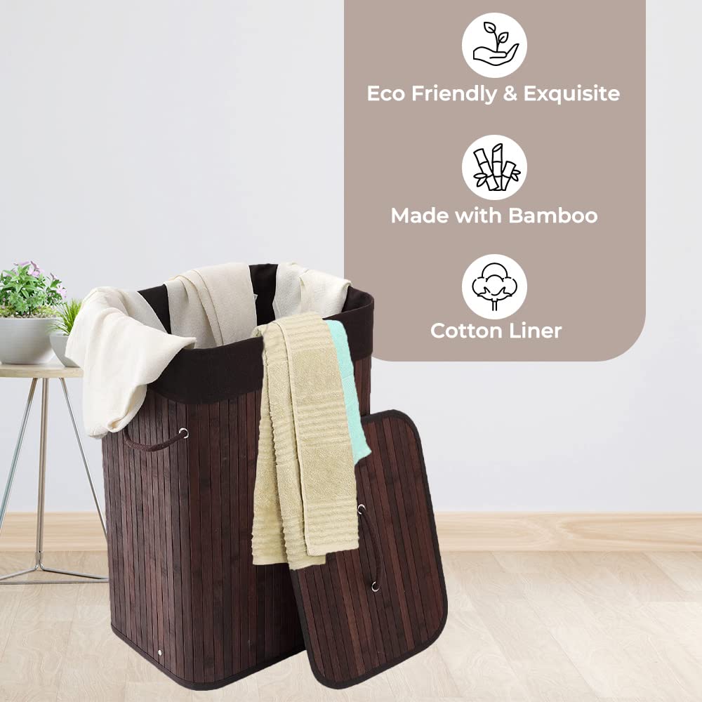 Kuber Industries laundry basket features a sturdy bamboo construction with a lid, offering a stylish and eco-friendly solution for organizing and concealing laundry items. Its bamboo material ensures durability and a natural aesthetic, while the included lid keeps contents hidden and neat. This laundry basket combines functionality and aesthetics for a practical addition to any home.