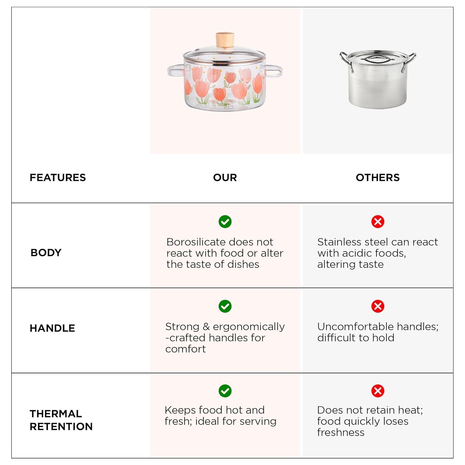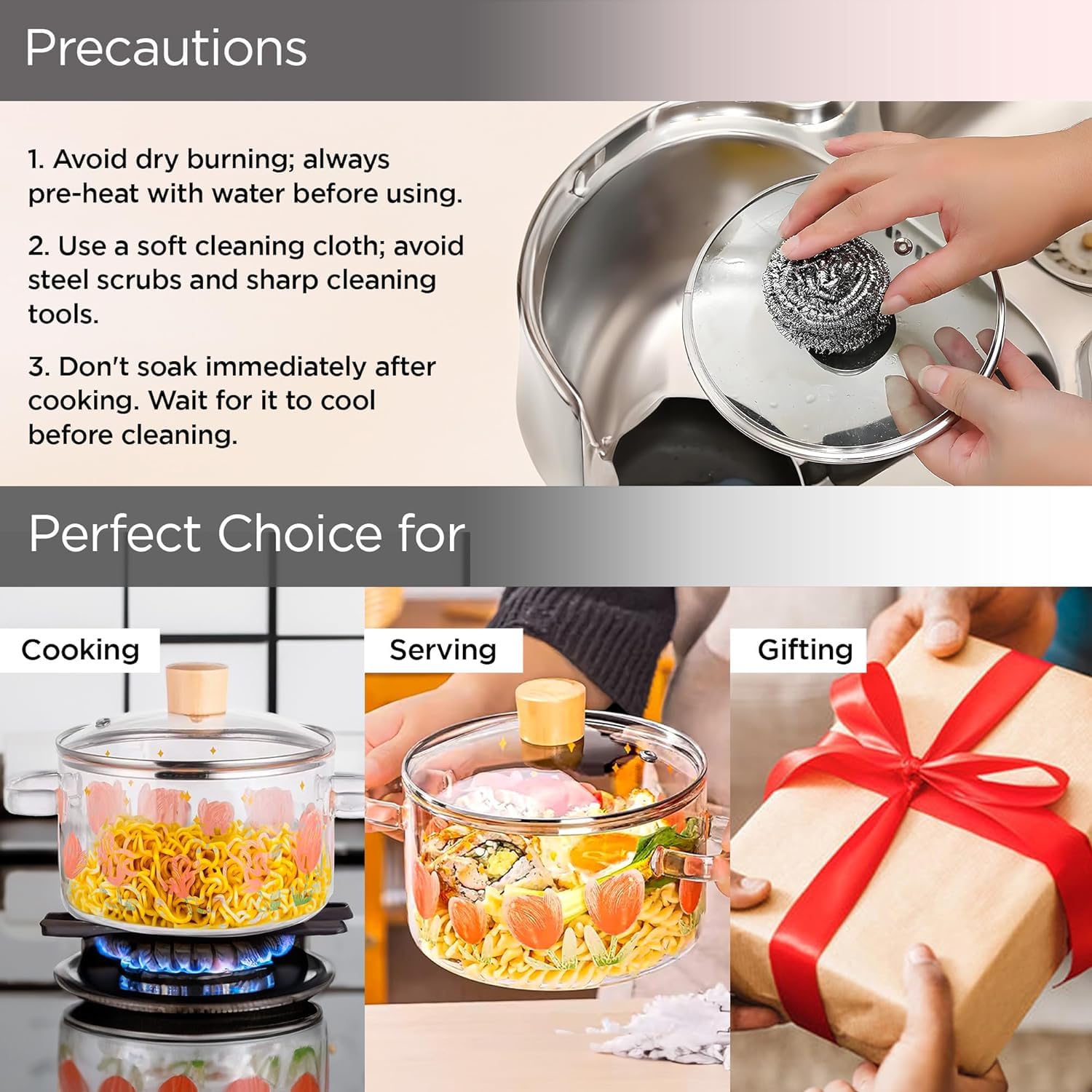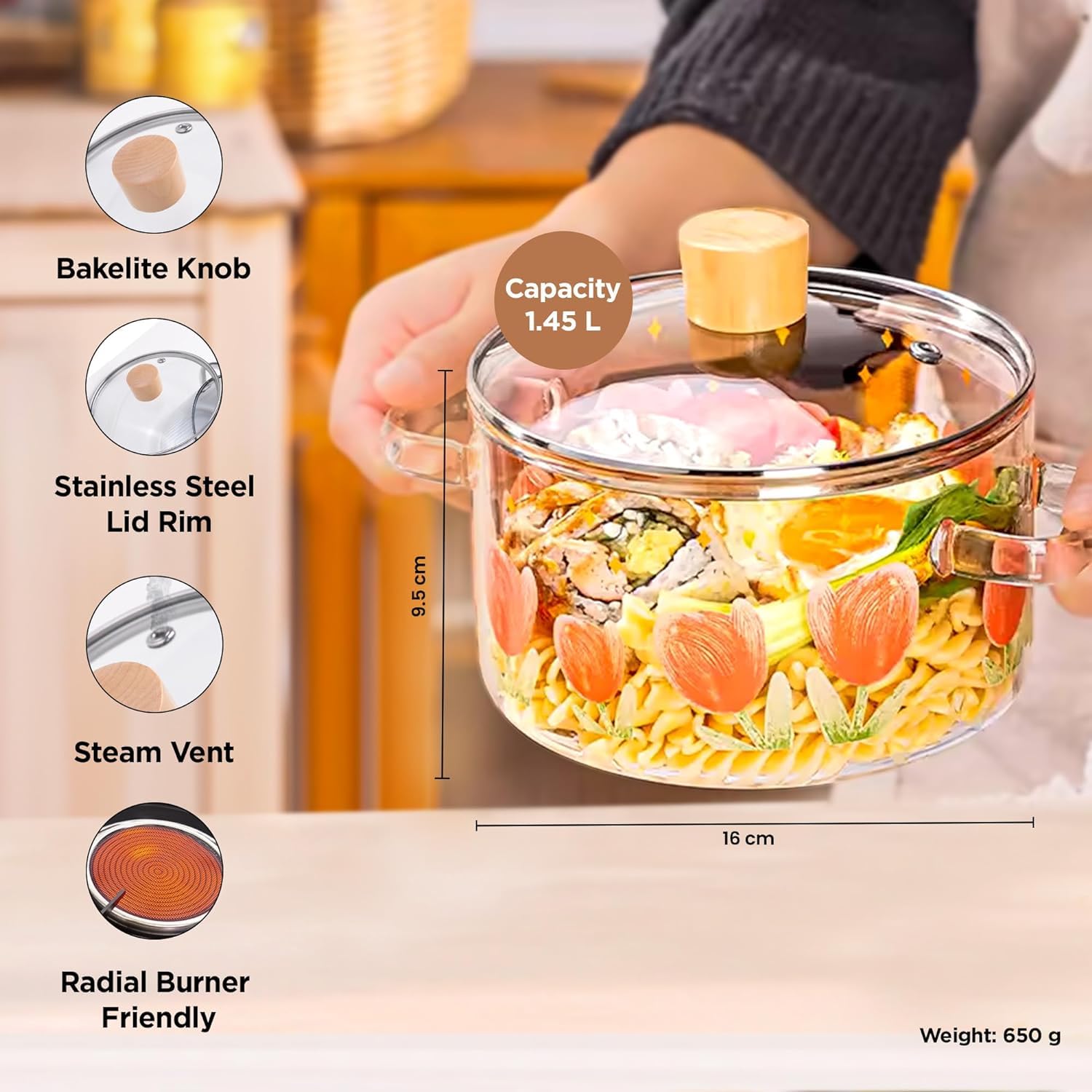 Crafted from high-quality borosilicate glass, our saucepan offers exceptional durability, heat resistance, and clarity. Borosilicate glass is renowned for its ability to withstand high temperatures without cracking or shattering, making it perfect for stovetop cooking, oven use, and reheating leftovers.With a capacity of 1.45 liters, our saucepan is ideal for preparing a wide range of dishes, from sauces and soups to grains and pasta. Its spacious interior provides ample room for ingredients to cook evenly and develop rich flavors, making it a versatile and essential tool in any kitchen.Detailed Specifications: