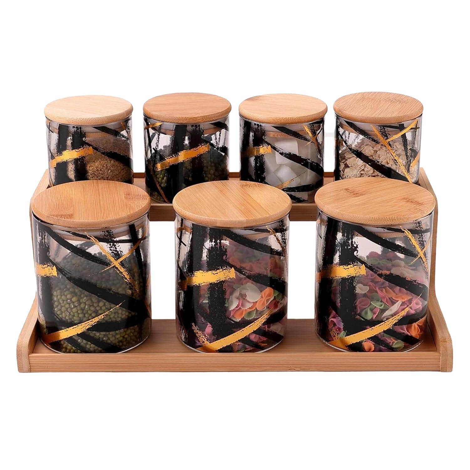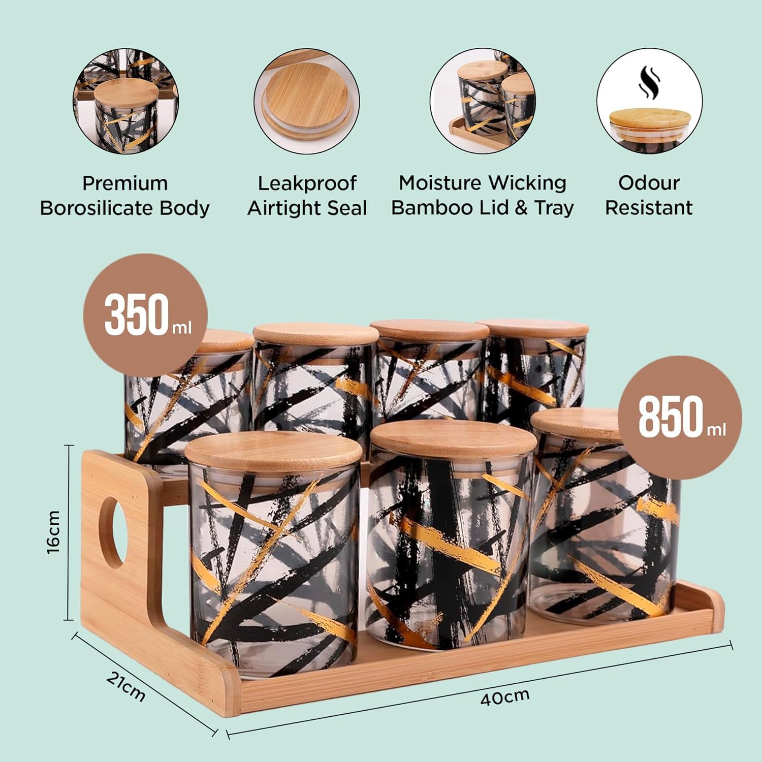 Declutter your pantry and embrace eco-chic style with Homestic 's 7-piece borosilicate glass jar set! Crystal-clear jars showcase your ingredients, while secure bamboo lids lock in freshness. Say goodbye to plastic and hello to sustainable beauty – these jars are as functional as they are fashionable. Perfect sizes for storing all types of items (4 x 350ml, 3 x 850ml) conquer countertop chaos, while the sleek bamboo stand adds a touch of natural elegance. Homestic 's jars are the perfect blend of modern convenience and eco-conscious living. Elevate your kitchen and your planet, one beautiful jar at a time!Detailed Specifications: