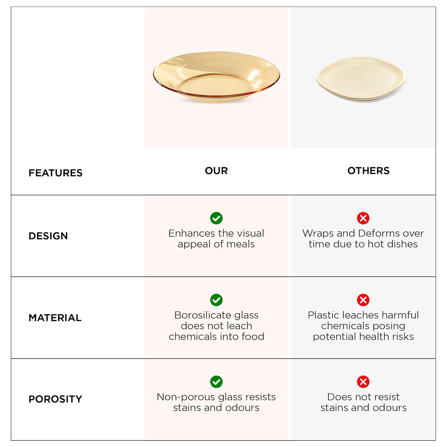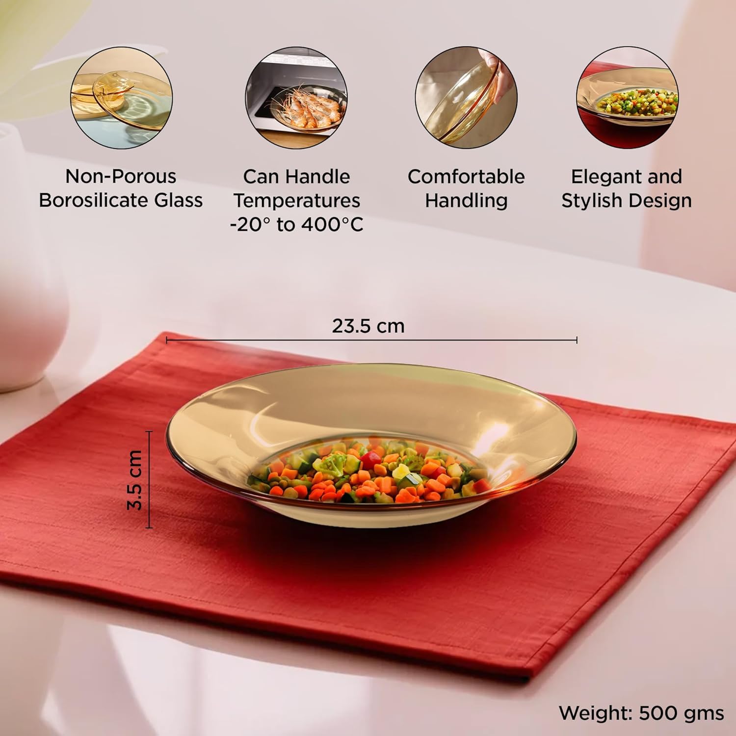 Add a touch of elegance to your dining table with the Heart Home Borosilicate Glass Plates set. Made from high-quality borosilicate glass, this set of 4 plates is durable, lightweight, and scratch-resistant. The smooth surface makes it easy to clean and maintain, while the stackable design helps save space in your kitchen. These plates are odor and stain-resistant, non-porous, and do not leach any chemicals after repeated use. They are also BPA-free and non-toxic, making them safe for everyday use. The transparent amber color adds a classic and stylish look to your table setting, perfect for family dining, festive occasions, or gifting to a friend or mother. Whether you are using them in the microwave or dishwasher, these plates are microwave and dishwasher safe, offering convenience and ease of use. The Heart Home Borosilicate Glass Plates set is a great value for money, ensuring you get good quality and durability with a beautiful design that satisfies your expectations. This dinner set is perfect for gifting, everyday dining, festive occasions, or occasional use, making it a versatile addition to your kitchen. With a size of 23.5 x 23.5 x 3.5 cm and a weight of 500 grams, these plates are suitable for all occasions and locations. The set includes 4 glass plates, providing value for money and meeting the needs of your family dining experience. Say goodbye to small plates and heavy crockery sets with the Heart Home Borosilicate Glass Plates set. The high-quality material, classic design, and durability of these plates ensure that you are satisfied with your purchase. Upgrade your dining experience with this elegant and practical dinner set from Heart Home .Detailed Specifications: