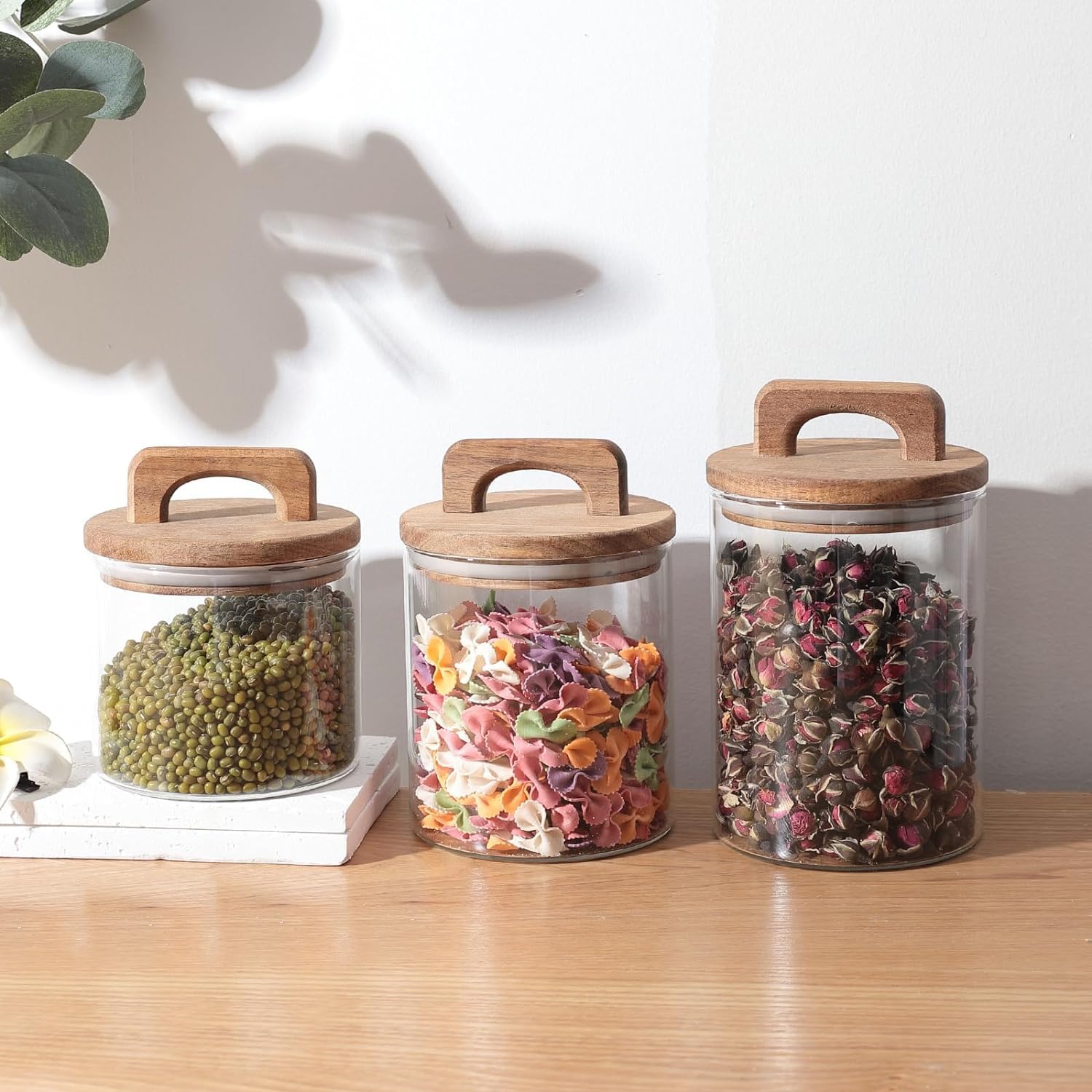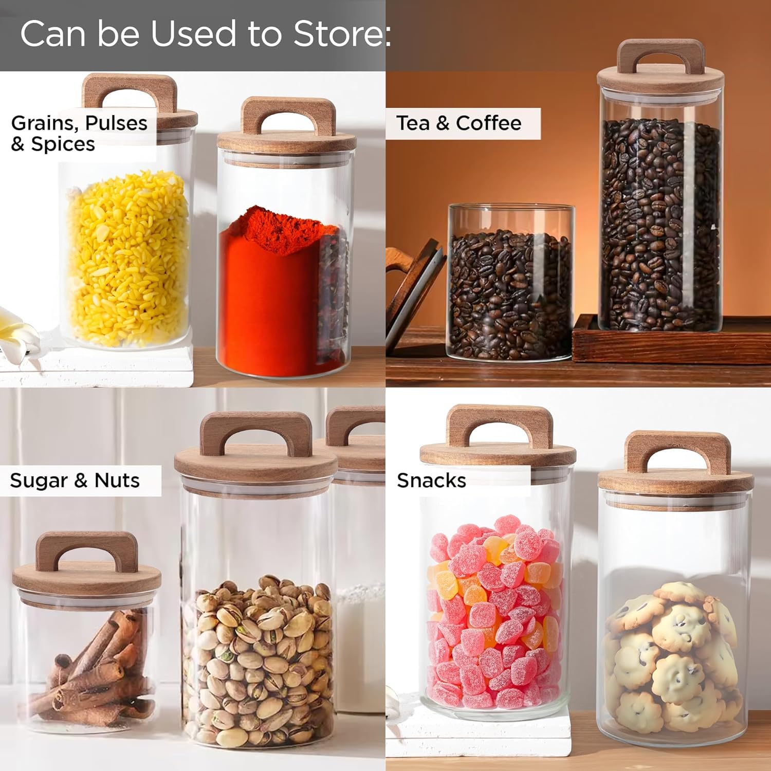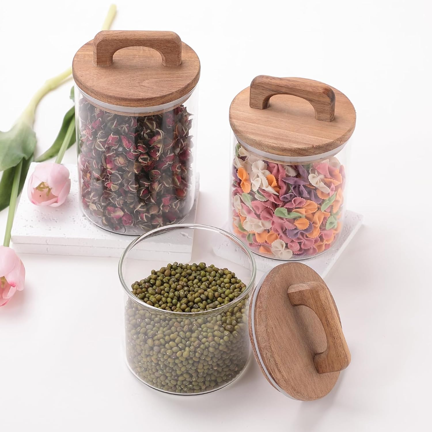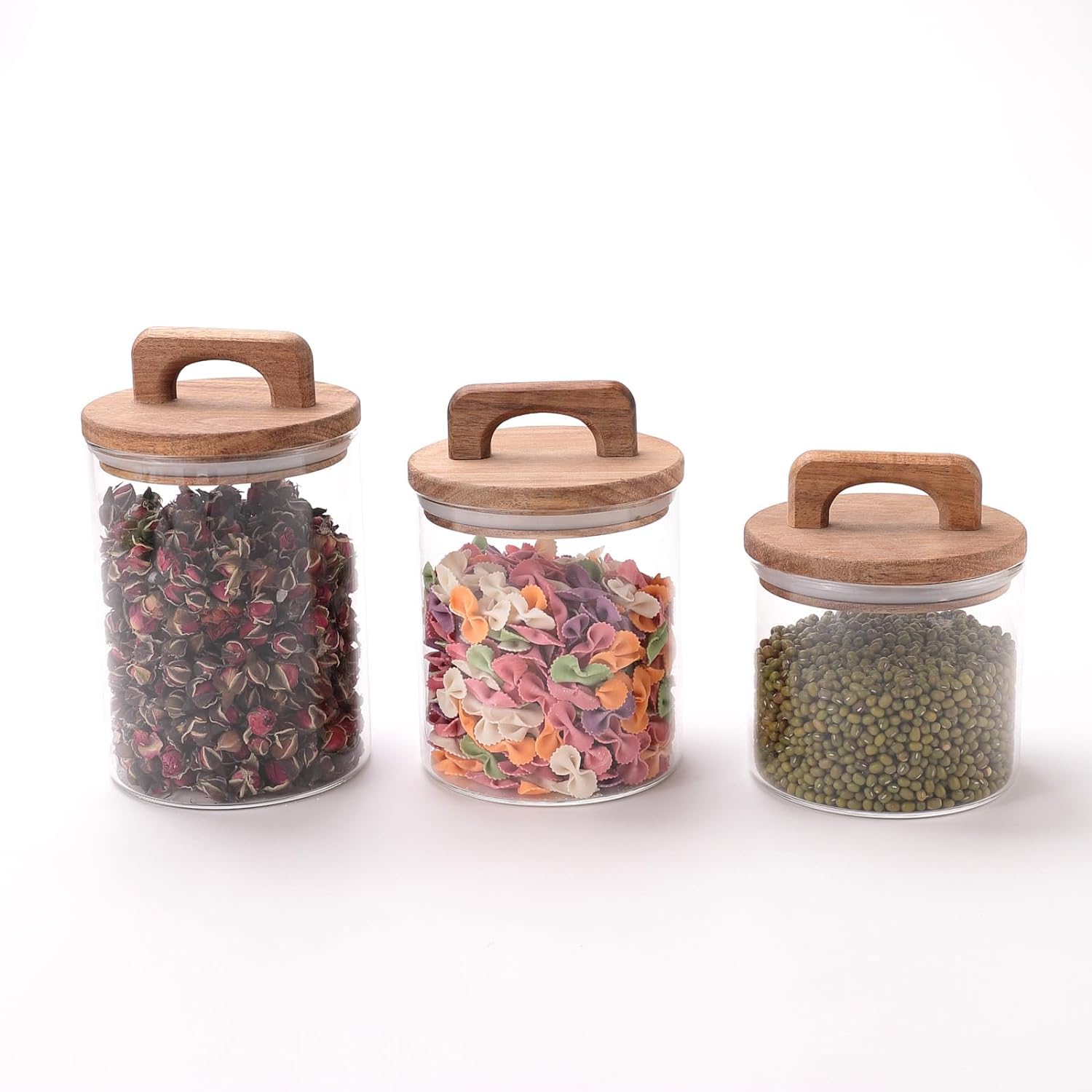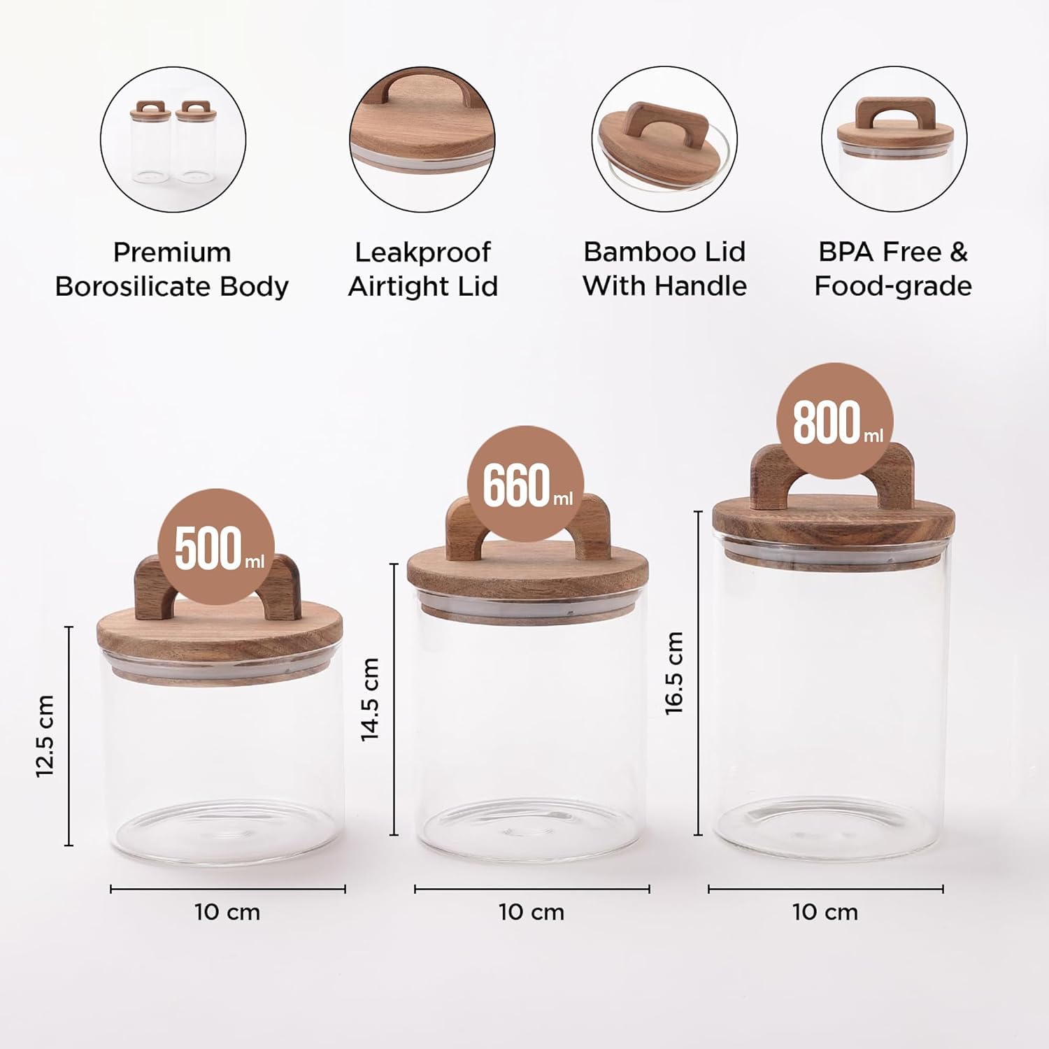 Introducing Kuber Industries 's premium set of Borosilicate Glass Jars with wooden lids and handles for your kitchen storage needs. This pack of 3 includes jars with capacities of 500ml, 660ml, and 800ml, perfect for storing a variety of items such as grains, pulses, spices, snacks, tea, coffee, sugar, nuts, and more. Crafted with airtight bamboo lids featuring food-grade silicone rings, these containers ensure your items stay fresh and free from moisture and dust. The borosilicate glass body is of the highest quality, resistant to high temperatures and durable for long-lasting use. The wide mouth design and large capacity make these jars versatile for storing a range of items like dry fruits, herbs, pickles, jellies, flour, pasta, candy, chips, cookies, and more. The metal loop on the lid allows for easy opening, adding a touch of aesthetic appeal to your kitchen storage. Kuber Industries 's glass containers are not only functional but also aesthetically pleasing, making them a thoughtful gift for mothers, sisters, or as a housewarming present. They are a valuable addition to any kitchen, offering sustainable and transparent storage solutions. Customers love the high quality and durability of these jars, as well as the overall aesthetic appeal they bring to the kitchen. With Kuber Industries 's Borosilicate Glass Jars, you can organize your kitchen in style while ensuring your items stay fresh and protected. Our product successfully addresses any concerns customers may have about lid issues, seal/vacuum problems, or quality/craftsmanship issues. Kuber Industries 's focus on quality, value for money, and aesthetic appeal ensures you get a product that meets and exceeds your expectations. Experience the convenience and elegance of Kuber Industries 's Airtight Glass Containers - the perfect solution for all your kitchen storage needs. Buy now and elevate your kitchen organization with Kuber Industries 's premium quality glass jars.Detailed Specifications: