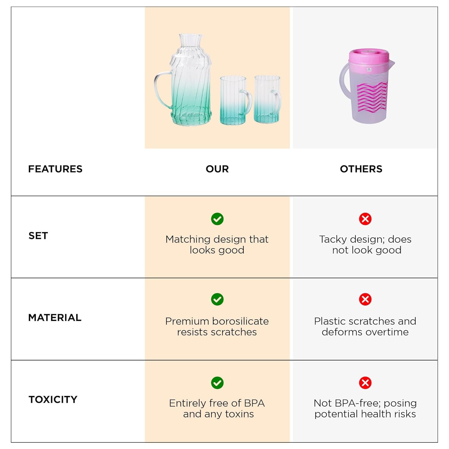 Introducing Kuber Industries 's exquisite Range of Borosilicate Water Jug collection, crafted to elevate your hydration experience. Merging elegance with functionality, each jug embodies the perfect harmony of style and practicality. Crafted from premium borosilicate glass, renowned for its durability and heat resistance, our water jugs are designed to withstand everyday use while preserving the purity of your beverages. The clarity of borosilicate glass ensures that the natural colors of your drinks shine through, enhancing the visual appeal of your table setting. Our range boasts a variety of designs, each tailored to cater to different tastes and preferences. From sleek and contemporary silhouettes to classic and timeless forms, there's a water jug to complement every aesthetic. The ergonomic handles provide a comfortable grip, ensuring effortless pouring without compromising on style. Whether you're serving refreshing lemonade on a sunny afternoon or ice-cold water during a dinner party, our jugs promise to be your trusted companion. With capacities ranging from intimate gatherings to larger celebrations, our Borosilicate Water Jug collection offers versatility for any occasion. Elevate your dining experience and add a touch of sophistication to your table with our exceptional range of water jugs. Choose quality. Choose style. Choose our Borosilicate Water Jug collection.Detailed Specifications: