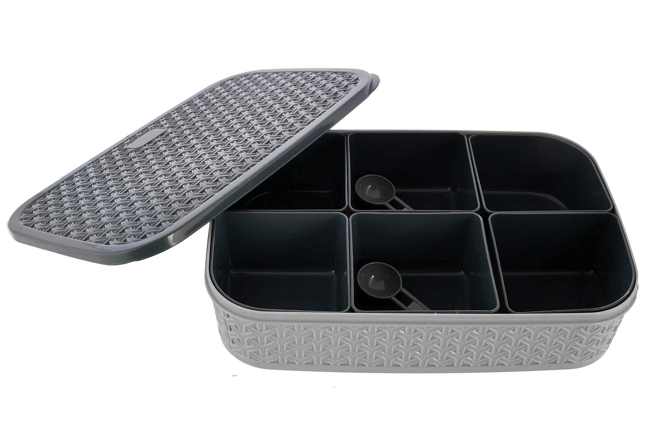 The masaldaani or the spice box occupies a pride of place in every Indian kitchen. With its collection of special spices, it is an essential storage item in every kitchen. When you open sealed packets spices, you need to store the contents in masala box containers to retain their natural goodness and freshness. The Kuber Industries masala box is ideal for storing essential spices and seasoning such as chilli powder, turmeric, jeera etc. It has 6 individual small containers made from high quality, food-grade and BPA-free plastic. The body of the spice container is shatterproof and safe to store in refrigerators too. This is a container that helps minimize clutter and organize the masalas in your kitchen. It also comes a plastic spoon for daily usage. What's more, the individual containers, the box and the lid are easy to clean and maintain.Detailed Specifications: