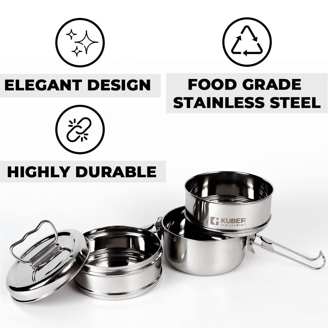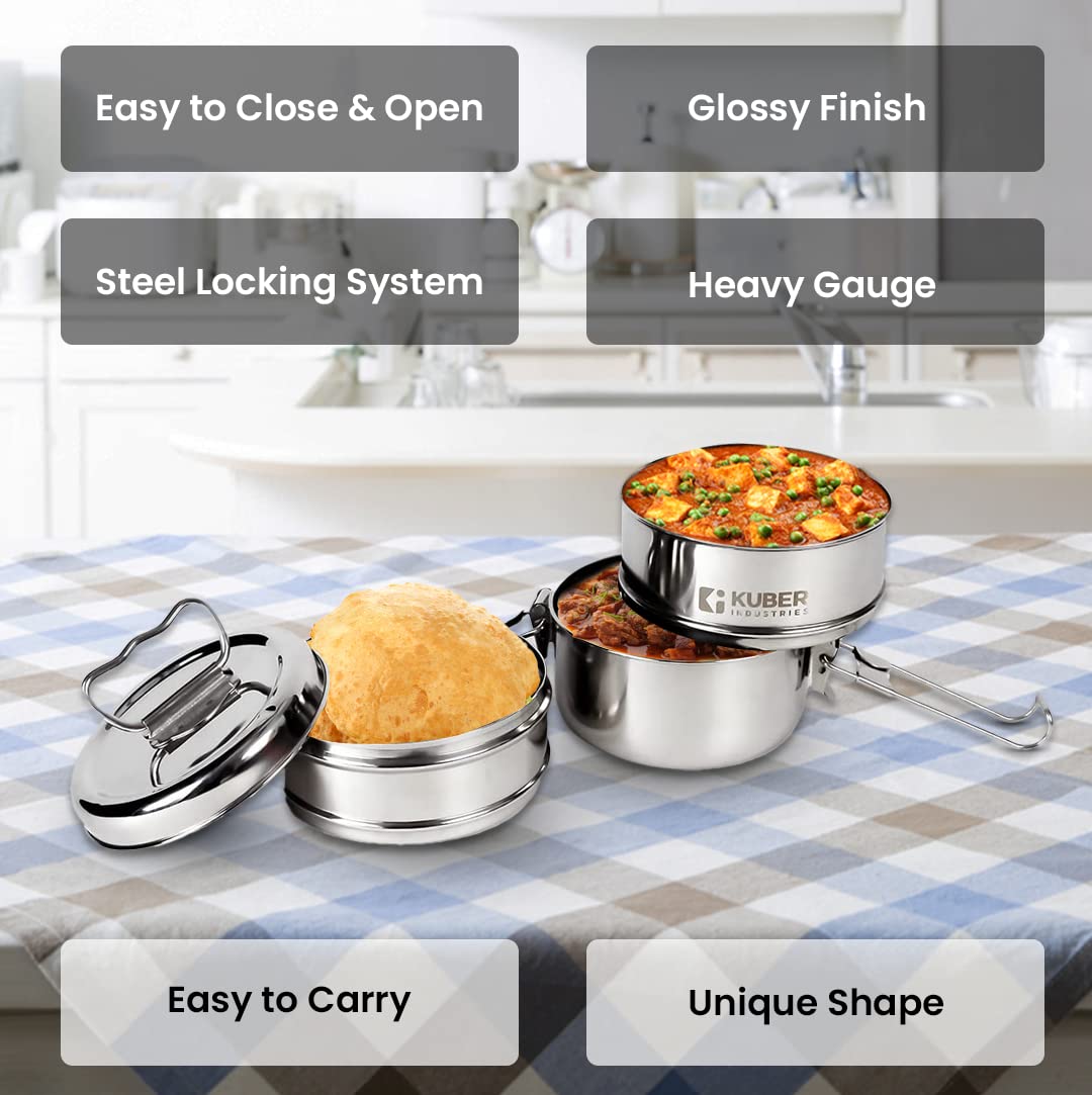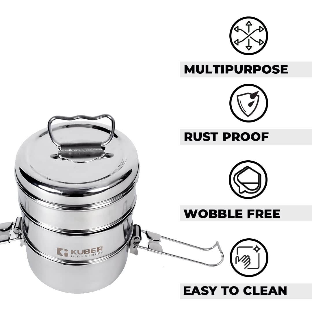 This 3 piece steel lunch box is shatter proof and is suitable for carrying food to office, school, camping or hiking. The blunt edge design and shiny finish gives an elegant touch to your stainless steel tiffin for lunch. This steel 1000 ml food container set is easy to clean and rust proof.