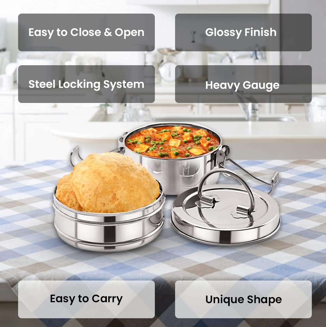 The stainless steel tiffin box with locking clip makes it spill proof to carry food to school, office, camping, hiking etc. keeping it fresh all day.Detailed Specifications: