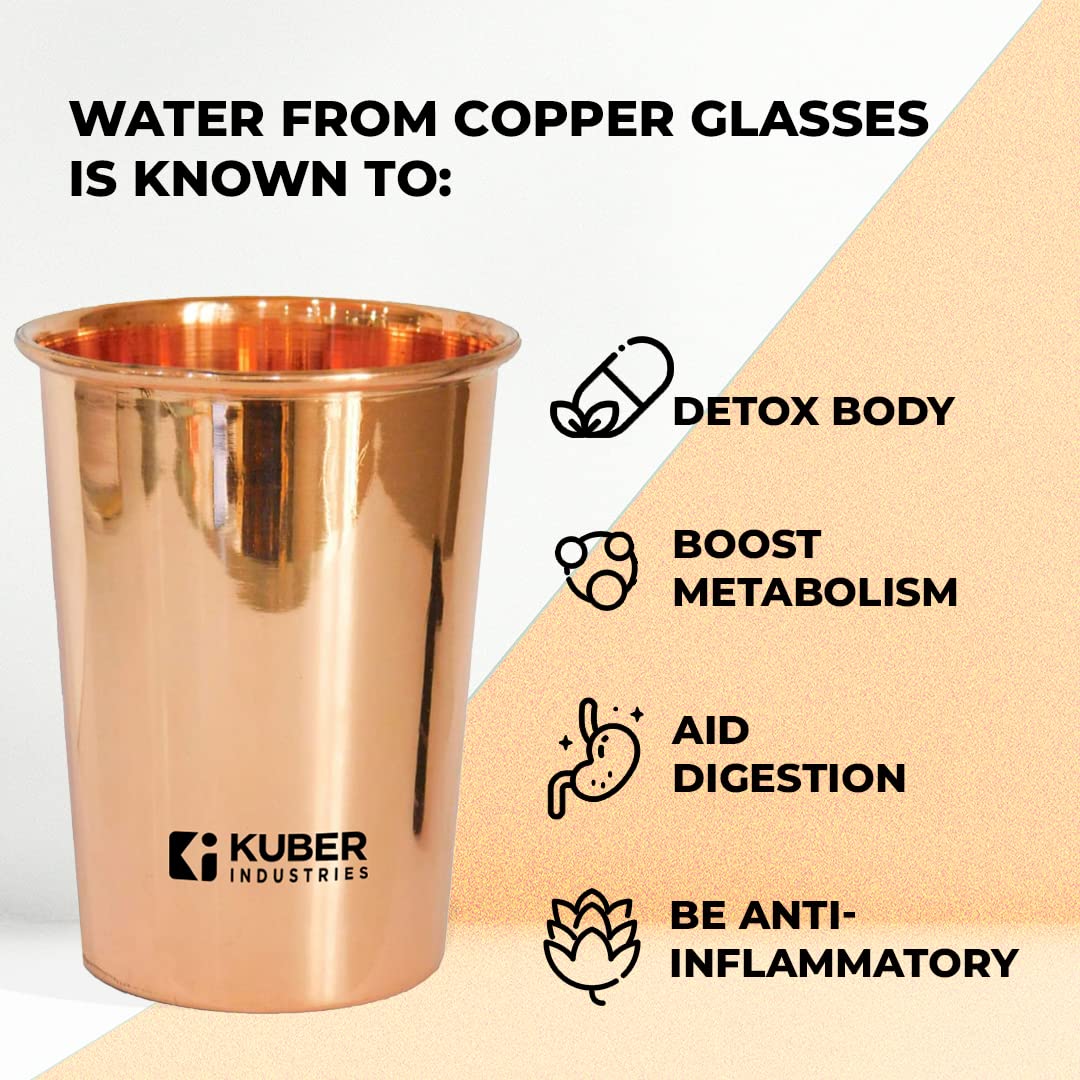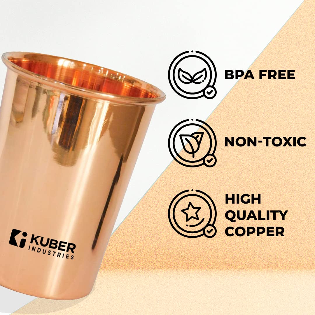 Kuber Industries brings you a range of copper bottles, glasses, jugs and lotas. These tumblers are made of BPA free and non-toxic copper materials, ensuring safe and hygienic drinking habits. Known for its anti-inflammatory and antioxidant properties, drinking water from a copper glass offers several benefits such as aiding digestion and detoxing your body. Due to its ergonomic design, these glasses are easily stackable, occupying only a fraction of your kitchen space. Highly durable and easy to clean, this copper glass set makes an excellent addition to your dinnerware.Detailed Specifications: