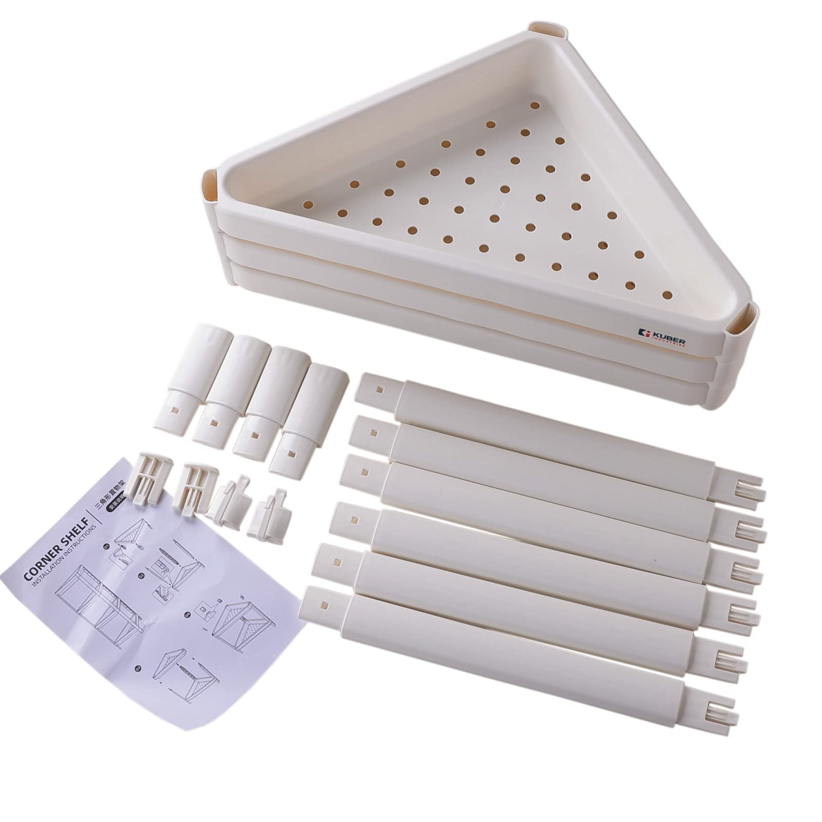 Kuber Industries Bathroom corner shelf is a great solution for keeping bath and body products organized in the shower or bath area. It fits nicely in the corner and does not take up much space. The shelves have drainage holes to prevent water from collecting, making it rust-proof and easy to clean. It comes in a 3-layer triangle shape and is easy to assemble, providing extra space for bathroom accessories. It is important to note that heavy items should be placed at the bottom to prevent tipping.