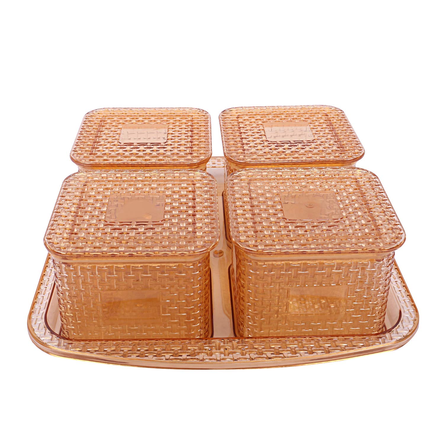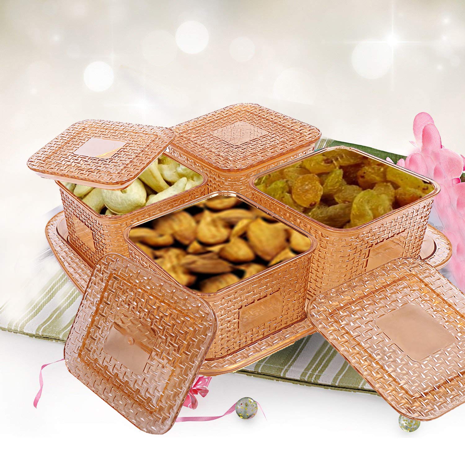 Kuber Industries Dry Fruits Tray is made of high quality plastic material which are 100% BPA (Bisphenol A) free. Containers are 100 % Air-tight to preserve freshness inside. this tray comes with four dry fruits boxes or containers. This multi-purpose set of two jars with lid and Tray is ideal for serving namkeen, dry fruits, snacks, mixtures, savouries in elegant style. This has an eye catchy look and excellent finish. This is used to serve and keep dry fruits, mouth freshener, chocolates, etc. This tray gives you a classy and royal touch to your serve ware and you can impress your special guests with it. This can be an ideal gift for your friends, guests and familiar persons on any occasion.Detailed Specifications: