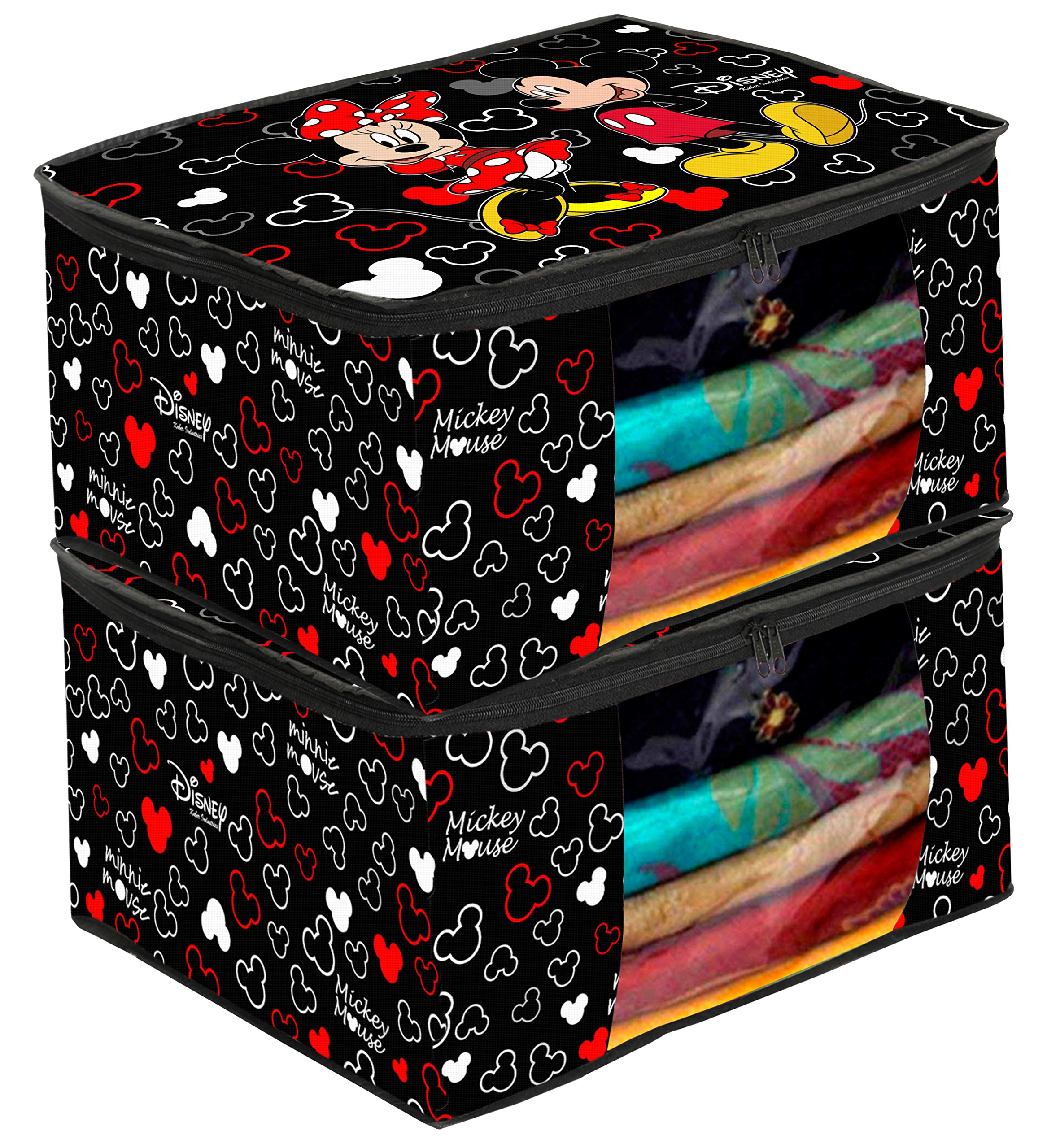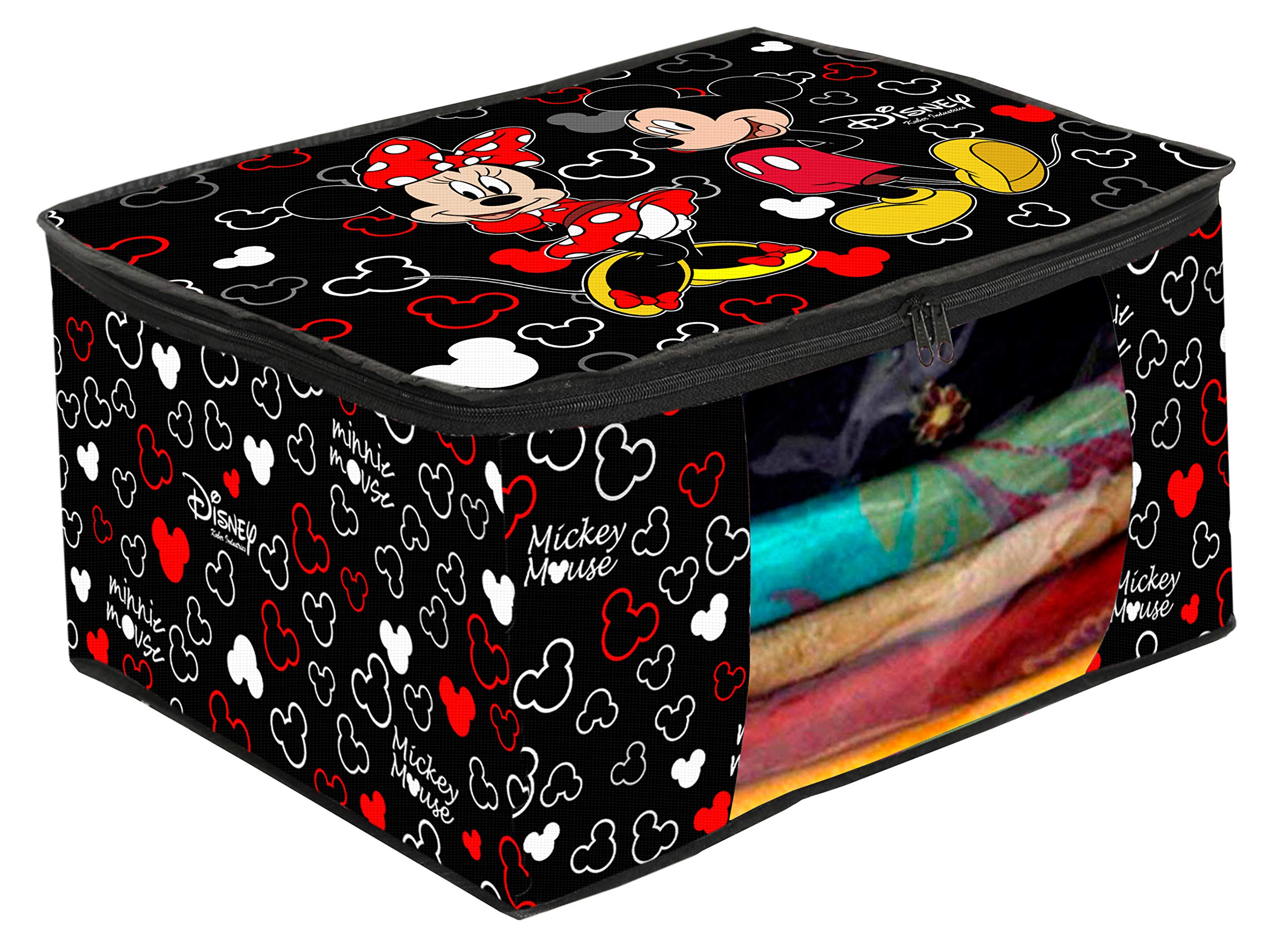Kuber Industries Non Woven Disney Mickey Print Saree/Clothes Cover with Window Kuber Industries non woven Disney Mickey Print saree cover to organize and store your heavy and costly sarees dust, dirt and water safe. This beautiful Disney Mickey Print makes your wardrobe looks beautiful and organized too. Transparent front window gives you the convenience of better visibility. 2 premium quality zippers for easy opening and closing. Made of VIRGIN 90 GSM non woven fabric makes it durable and water repellent too. Best option to use while travelling.Large Front Window to instantly know what is kept inside without opening the bag again and again.Cotton breathable fabric to keep your stuff inside protected from dust dirt and bad spell. Quilted from all the sides to give cushion to whatever is stored inside.Description