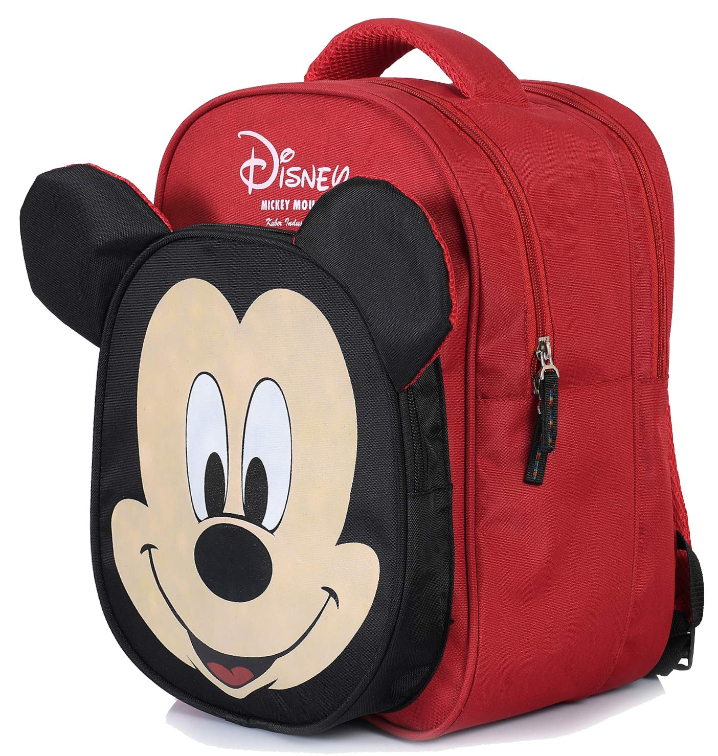 Outer Material: Polyester, Color: Red:: black.It is water resistant school bag..Number of compartments: 3. Capacity: 20 liters; Weight: 430 grams; Dimensions: 27 cms x 20 cms x 38 cms (LxWxH).this bag comes with attractive mickey print on front. Made up of durable and quality Polyester material. Spacious to accommodate all your essentials..Two adjustable shoulder straps. 2 main compartment and 1 front compartment 1 water bottle side mesh pocket. Haul loop. Light weight and easy to carry..Fashionable, light-weight, soft and colorful, a perfect gift for your kids. It is very soft and lightweight..Its can be used up to 5th standard class.Detailed Specifications:
