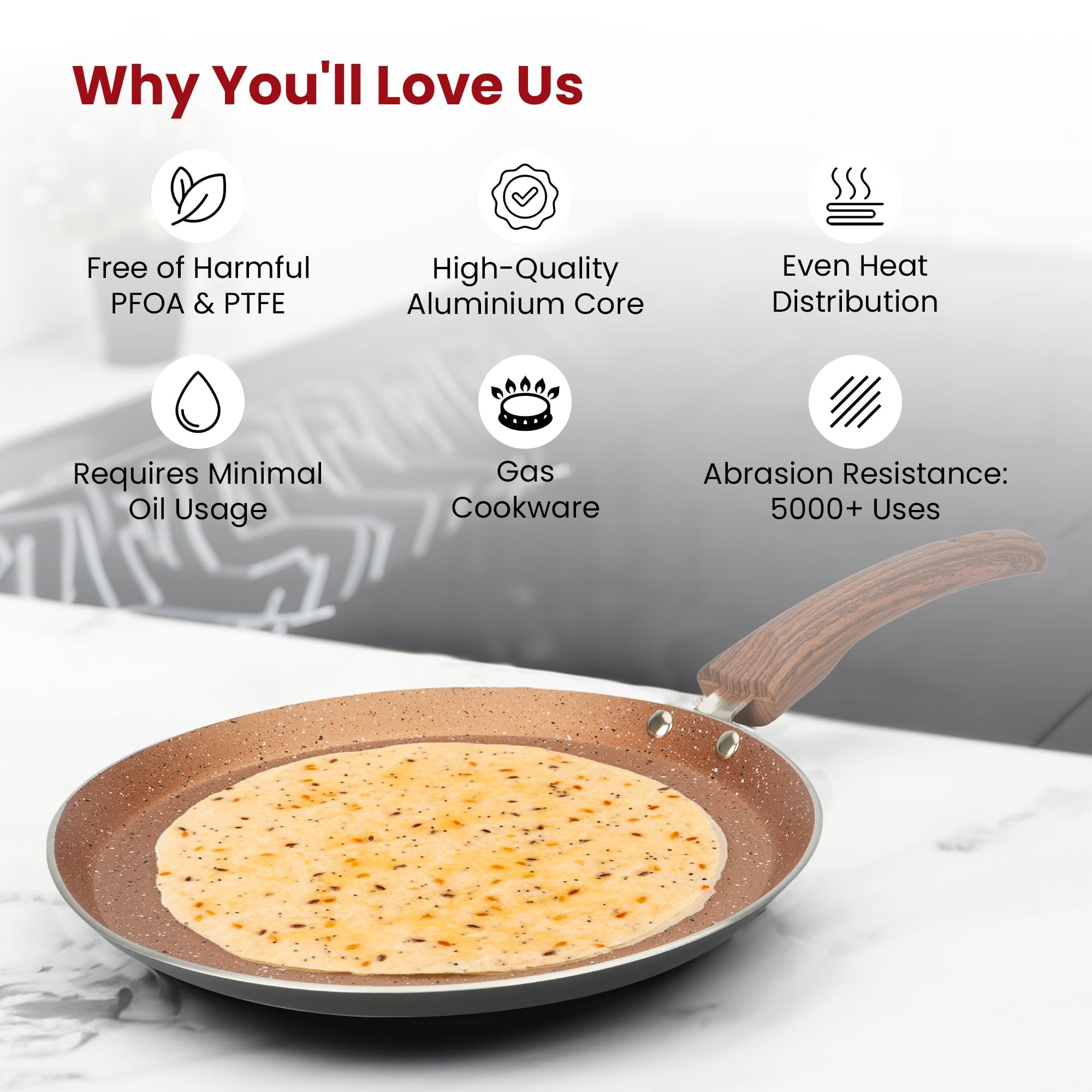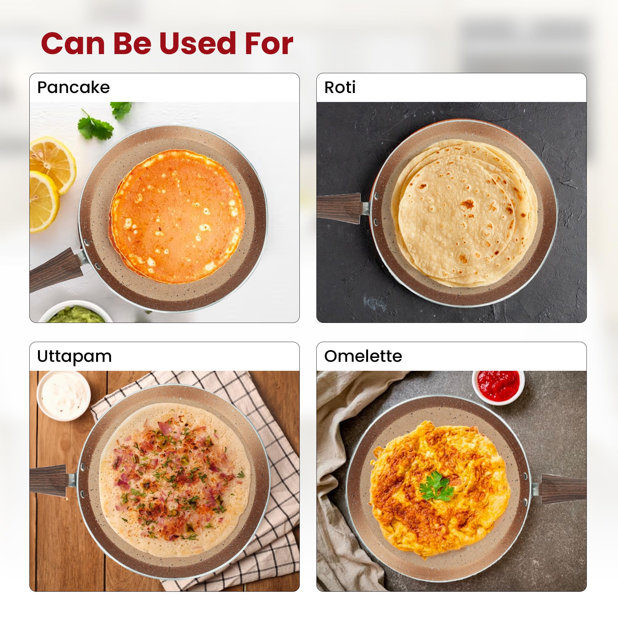 This dosa tawa non stick pan cooks your favorite dishes without sticking because its high-grade material surface is scratch-resistant. You can use our nonstick tawa on induction stoves since it is induction compatible. The revivted bakelite handle on this dosa pan stays cool, which makes sure you can handle it safely. This induction tawa pan distributes heat evenly so your food cooks well every time.Detailed Specifications:
