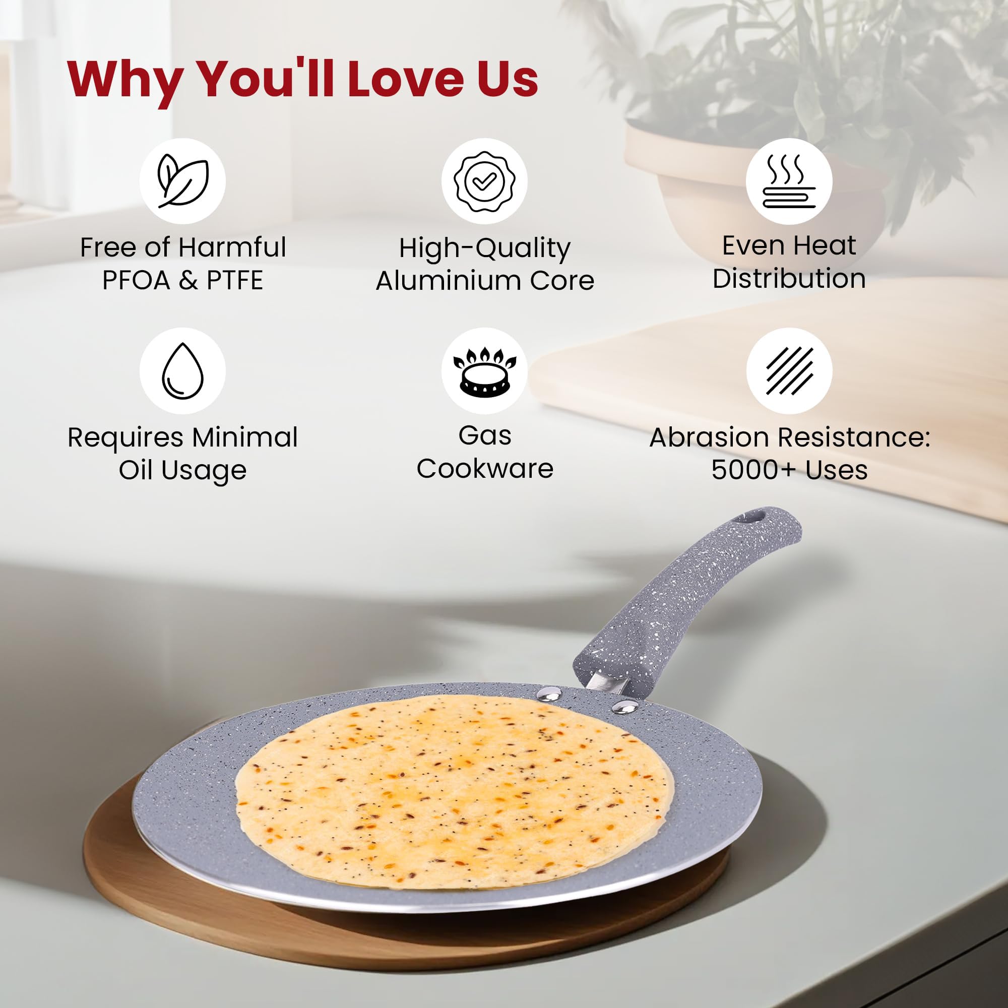 This dosa tawa non stick pan cooks your favorite dishes without sticking because its high-grade material surface is scratch-resistant. You can use our nonstick tawa on induction stoves since it is induction compatible. The revivted bakelite handle on this dosa pan stays cool, which makes sure you can handle it safely. This induction tawa pan distributes heat evenly so your food cooks well every time.Detailed Specifications: