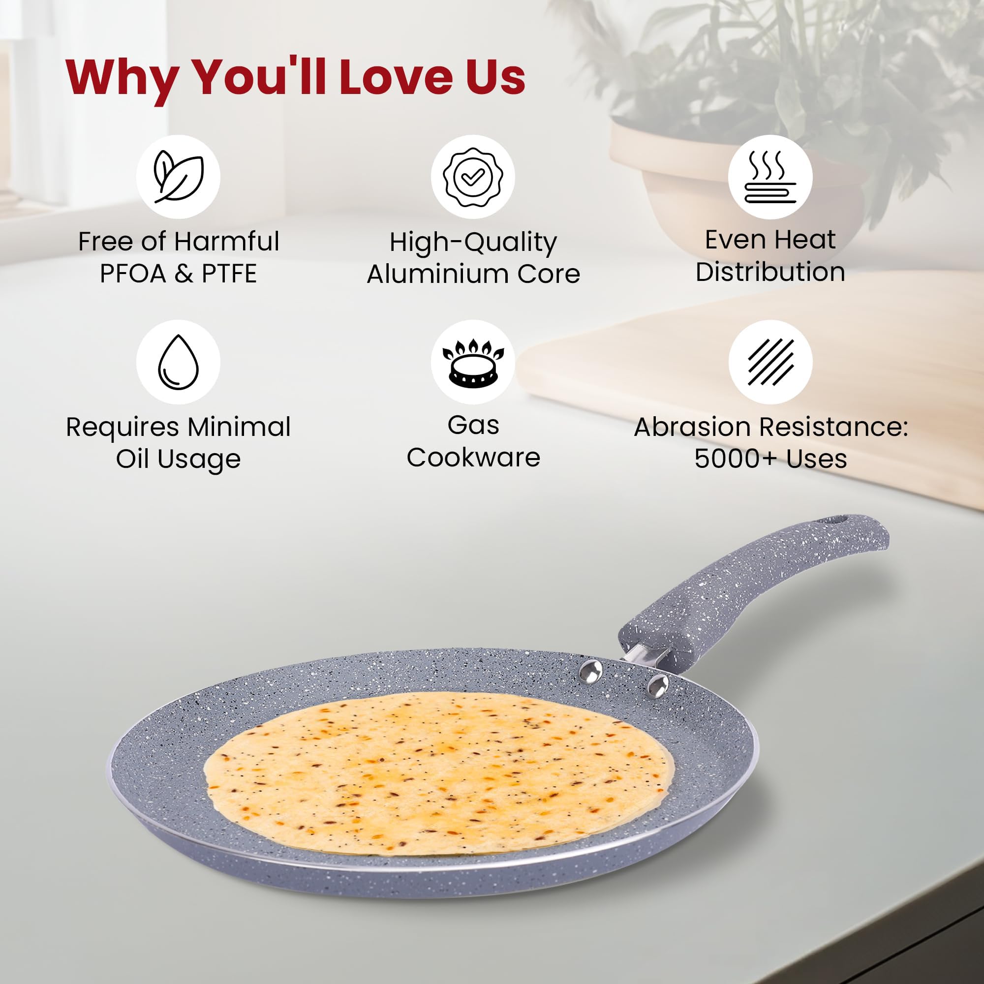 This dosa tawa non stick pan cooks your favorite dishes without sticking because its high-grade material surface is scratch-resistant. You can use our nonstick tawa on induction stoves since it is induction compatible. The revivted bakelite handle on this dosa pan stays cool, which makes sure you can handle it safely. This induction tawa pan distributes heat evenly so your food cooks well every time.Detailed Specifications: