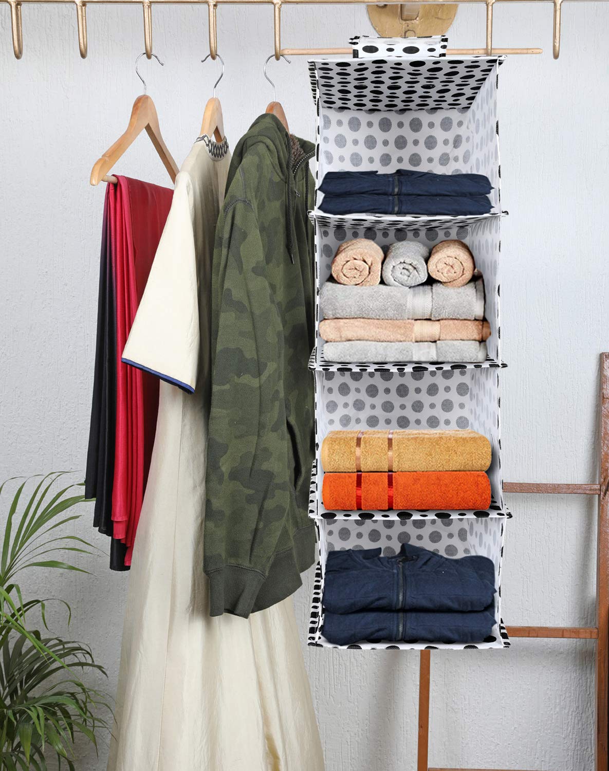 Hanging Closet Organizer, 4-Shelves Closet Hanging Sweater Organizer Collapsible Hanging Storage Shelves for Clothes, Pants and Shoes, Coffee Easy Installing Either with the hook and loop or the hooks, two hanging methods help the closet fit on most garment rods. Sturdy Thickened Board: Thickened boards inside help to share the weight and prevent the shelf from sagging. They can bear a 40 lbs heavy load and not bend the top. Multifunctional Use: Clothes, underwear, cosmetics, books, toys, sundries. .Pick up everything you mess up, use space more efficiently and cleanly. Collapsible Design: It is simple and easy to assemble, you don’t need an expert to assemble or disband it. You could simply fold it up when you don’t use it.Kuber Industries is a customer-loved brand that brings you everything you need to make a house a home. Right from nifty storage solutions to smart kitchen essentials, our products are known for their premium and durable quality.