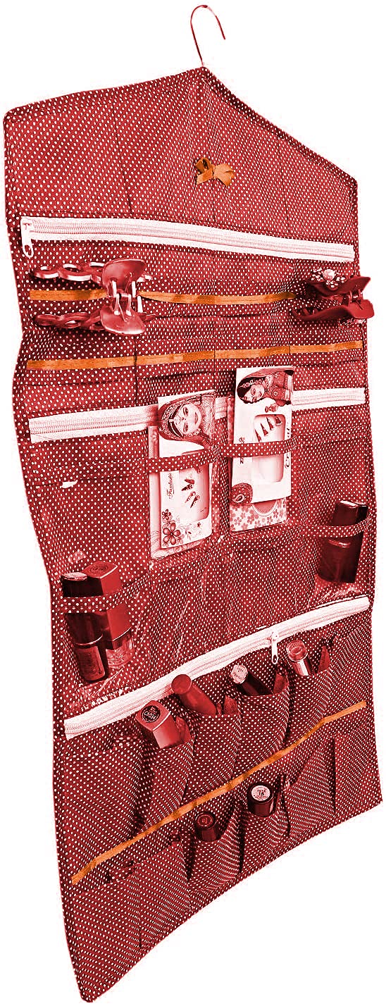 Kuber Industries multifunction with multipockets Storage Bag Door Wall Hanging Long life High quality dressing kit for organizing your costly and favorite make up material. You can hang it anywhere in your home, Comes with steel hanger ,so you can easily hang anywhere in your home. Prevent your favourite daily use make up material from dust and moisture. Multipurpose Kit, Bindi Kit, Make Up Organizer, Daily Use Kit, Earrings,Pendants,Necklace,Bracelet, Ring, Watches,Chains,Pearl Jewellery,Accessory,Head rope,Headband or nail polish, cuffs, makeup brushes, Eye shadow etc. It can rolls up for easy carry, perfect for travel,Convenient to carry your Jewellery !Detailed Specifications: