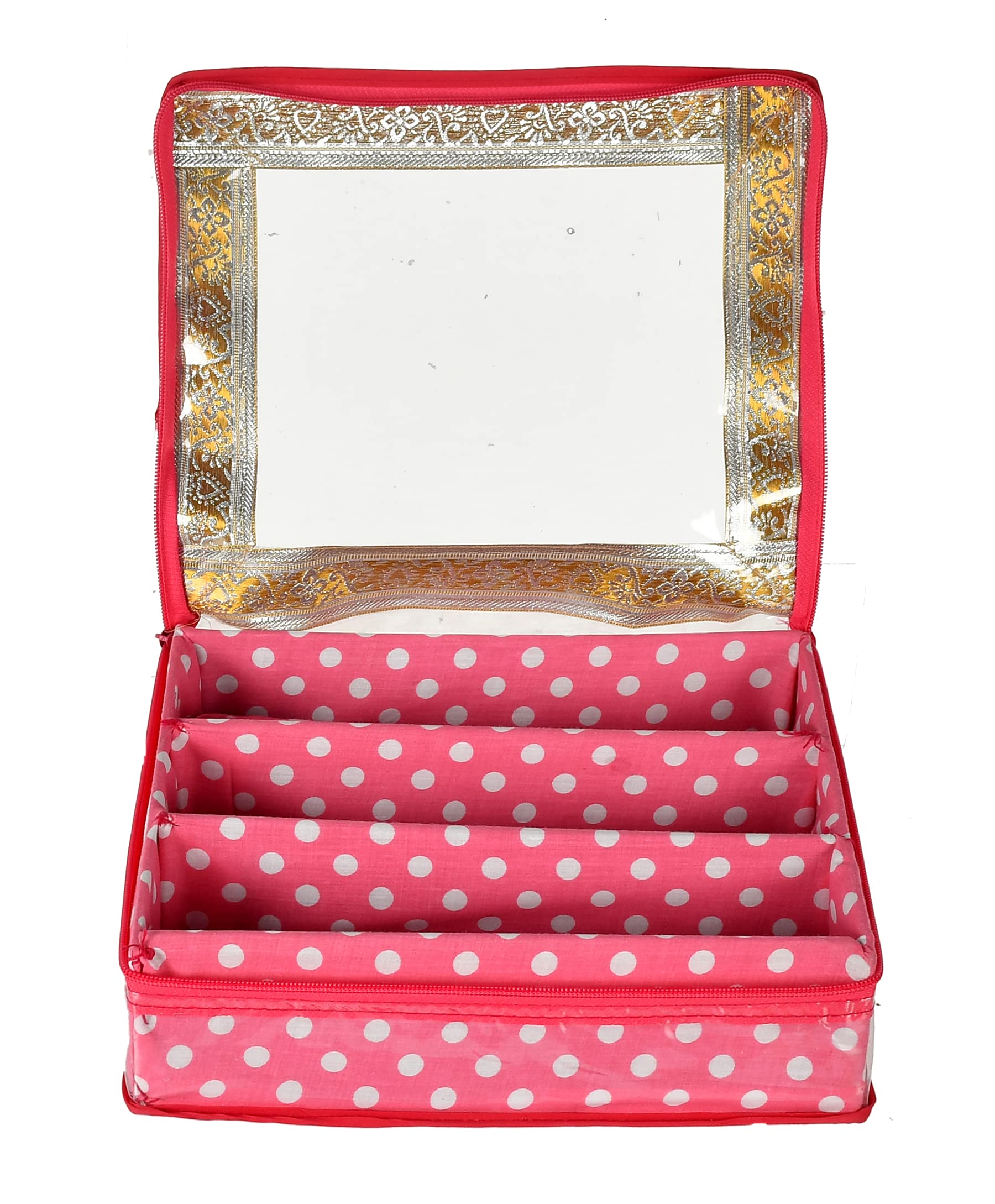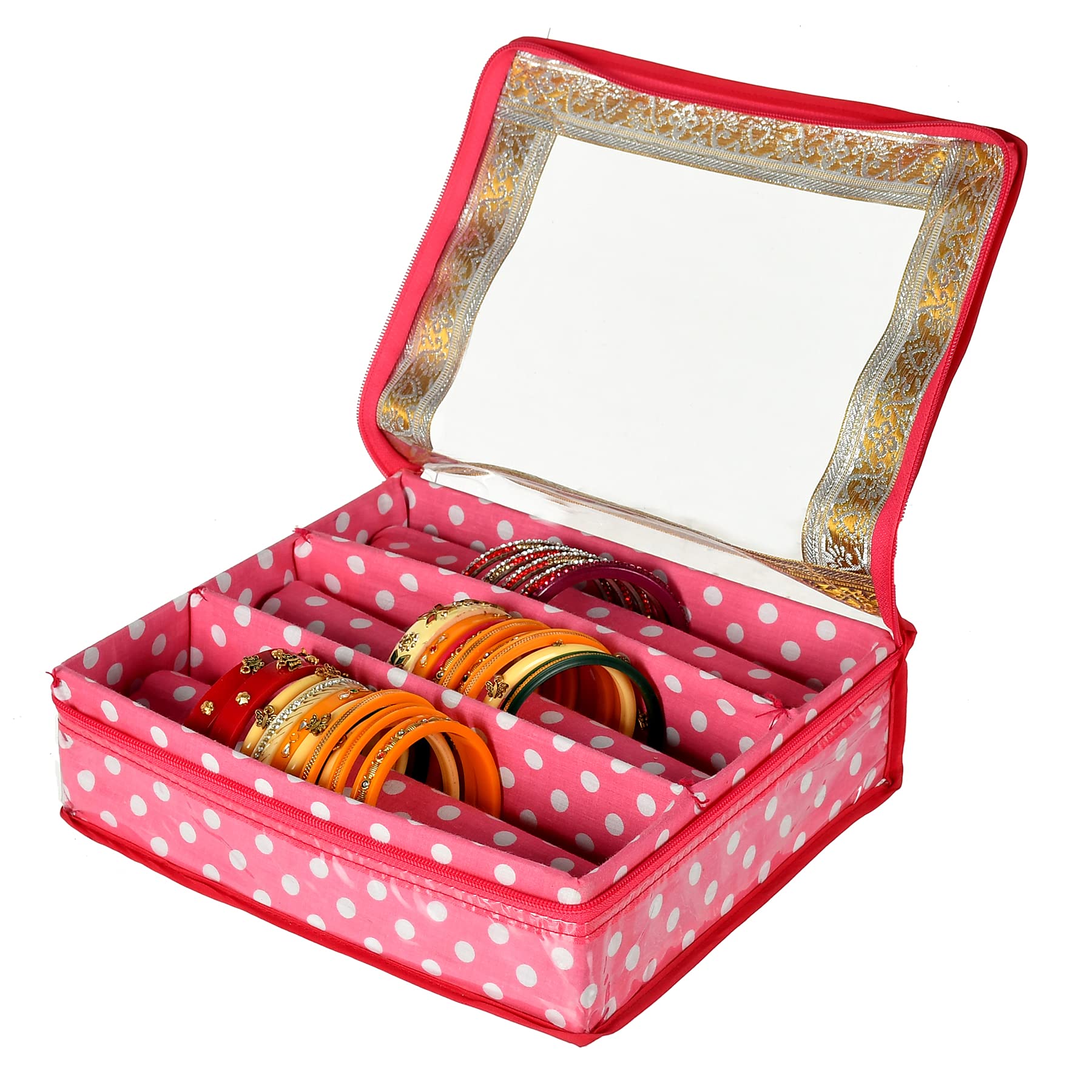 Kuber Industries Bangle box is made of good quality pvc material so, this is very durable, long-lasting and very useful. A bangle is an ageless accessory that has a special place in every woman's collection. The bangle box or a casket is a beautiful container and is mostly used to keep many high-end accessories and precious jewelry. The bangle box is a one-stop solution to all the problems. The safety of bangles is ensured as it has a high-class supportive frame that serves the purpose well. The classy bangles can be saved from any kind of vulnerability of harm or damage. It prolongs the natural shine and shimmer of the bangles that make them look like new and brings in loads of appreciation. The arranged bangle box saves you from extra efforts to save the most complimenting thing of your jewelry. It can prove to be the most beautiful gift ever if you plan to give it to your near and dear ones. The box can also be a holder of minute earpieces or very small jewelry. It prevents any loss or misplacement of any jewelry kept inside it the future use.Detailed Specifications: