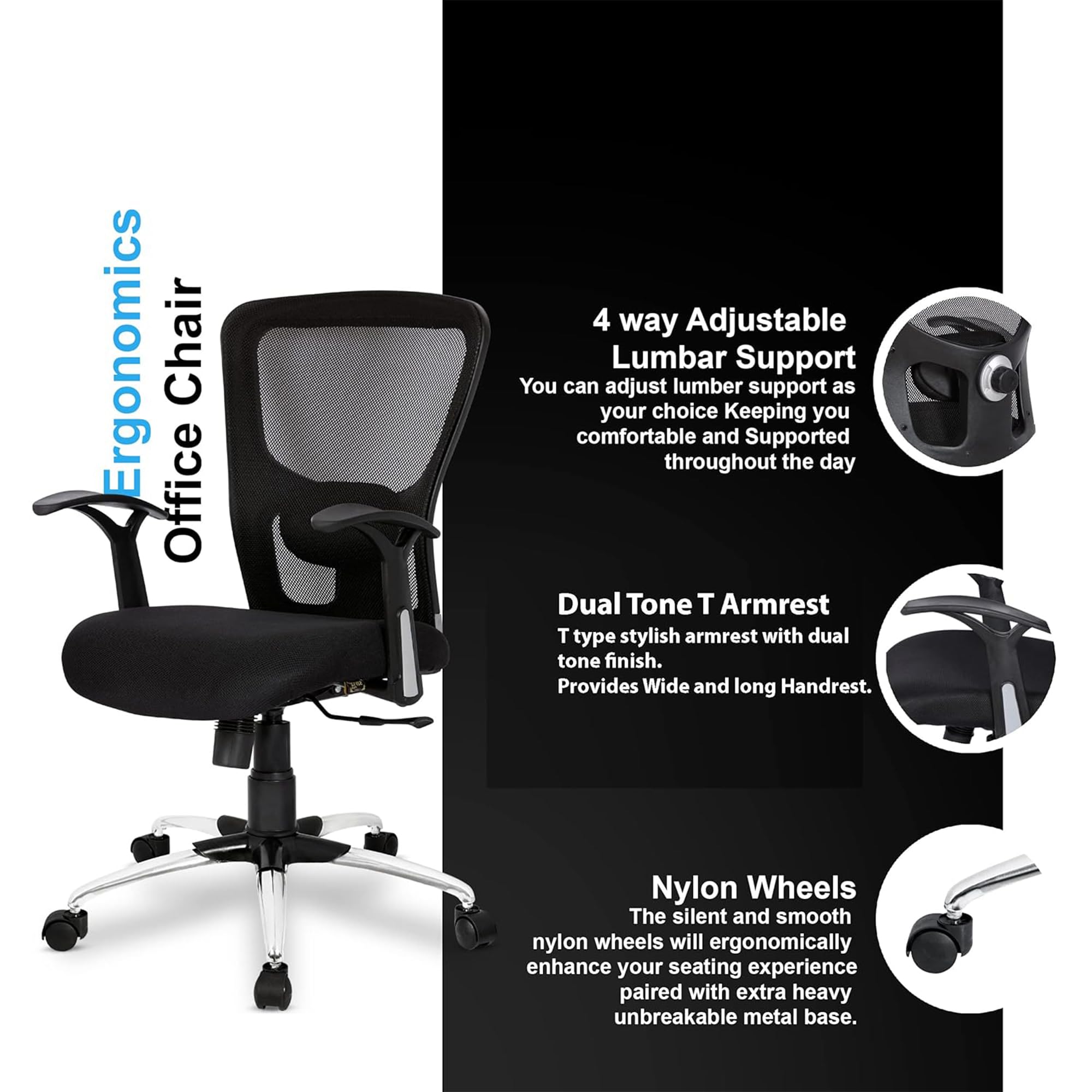Kuber Industries Ergonomic Office Chairs for Work From Home | Comes with Manual Height Adjustable, Armrest & 2D Lumbar Support | Comfy Study Chair for Students with Wheels | Black