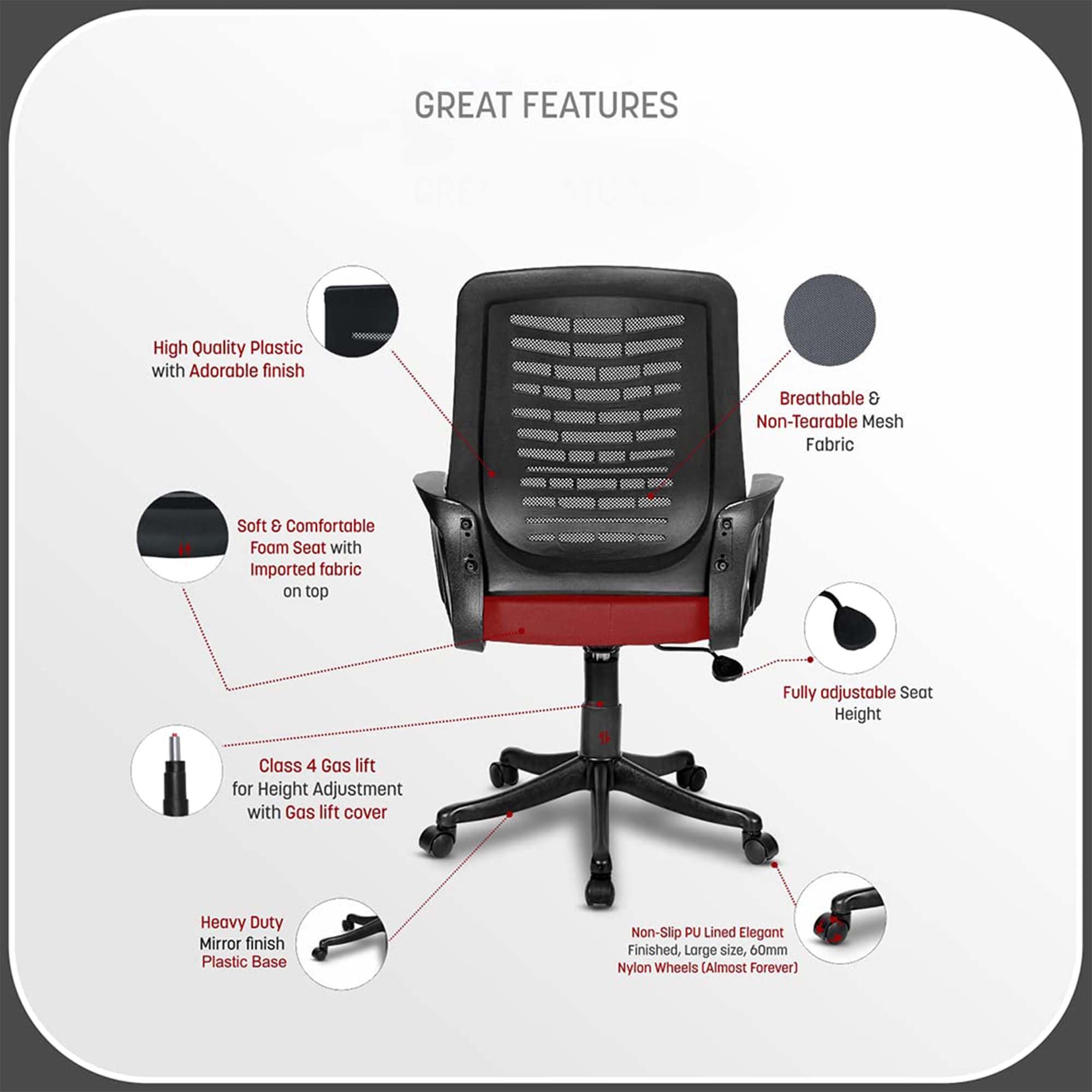 This chair office is perfect for work from home because it has arms which make sure you stay comfortable all day. Our rotating chair allows easy movement so you can switch tasks without any inconvenience. It is designed for mid-back support which is great for long hours. This chair is also ideal for students who need a sturdy study chair which can keep up with their study sessions. Don't worry about long hours since it makes sure you have the comfort you need.Detailed Specifications: