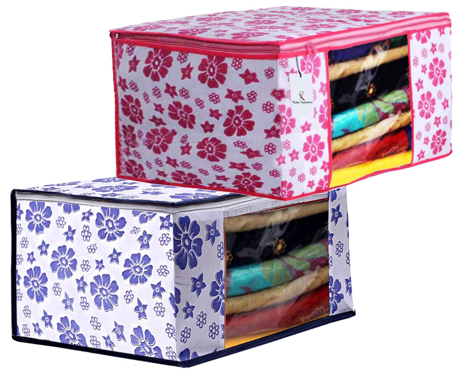 Material: Non Woven, Color: Pink & Blue. Design- Flower .Package Contents: 2 Piece Saree Cover .Size: 43 cm x 35 cm x 22 cm .Made from durable, wear and tear-resistant non-woven fabric. Lightweight and flexible saree covers .Carefully stitched to offer additional strength. Ideal for storing sarees and protecting them from dust and insects .Transparent see-through window for easy identification of contents. Durable zipper for easy opening and closing.Detailed Specifications: