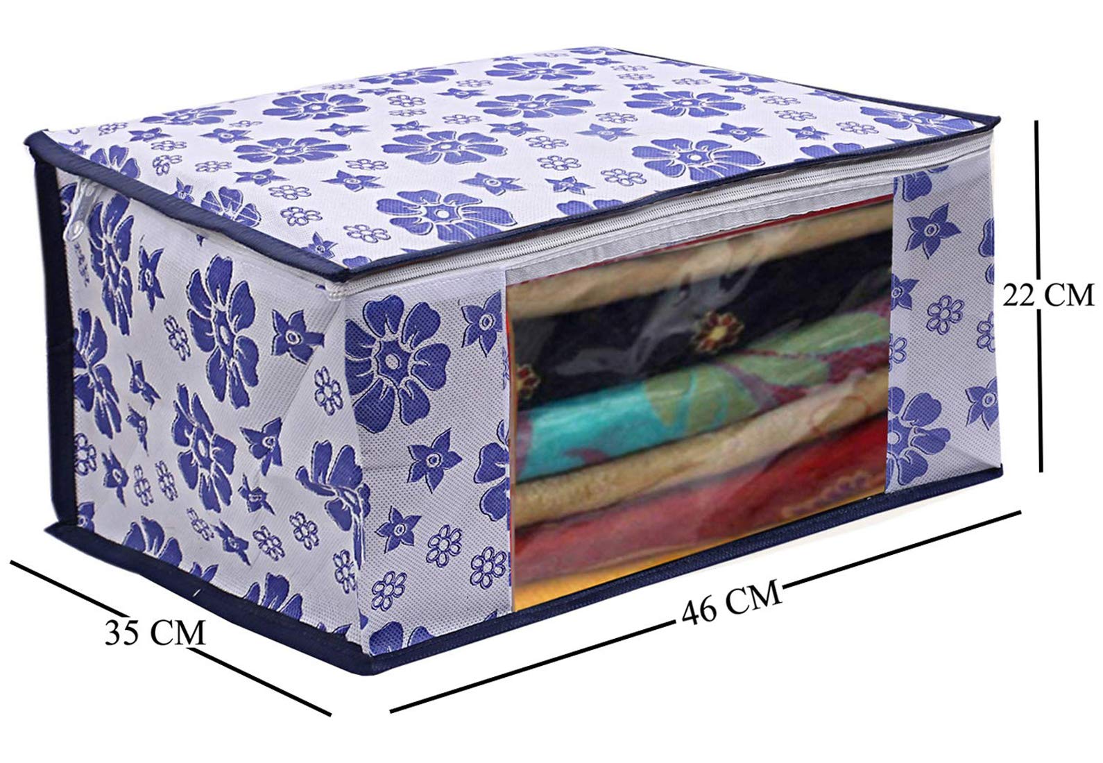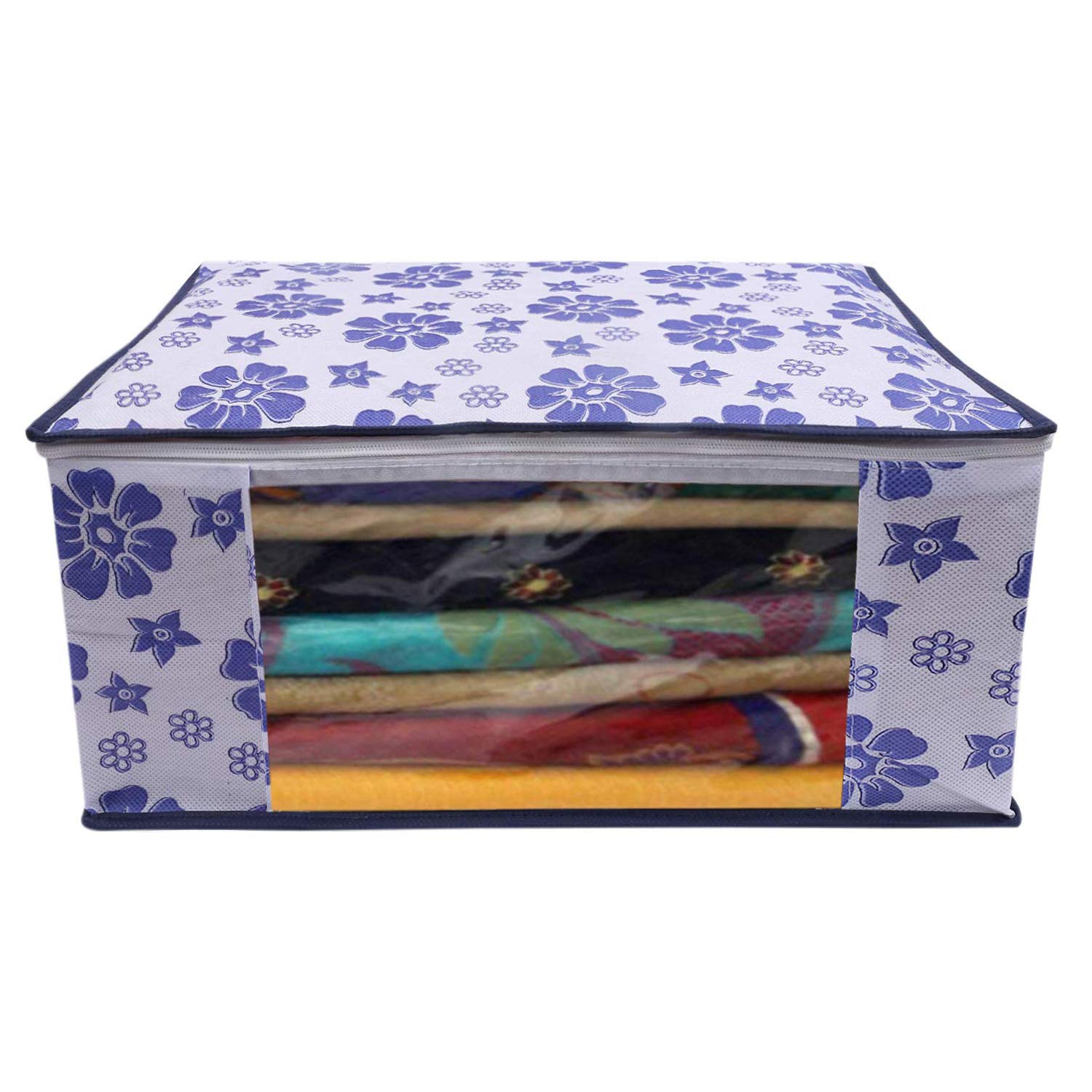 Material: Non Woven, Color: Royal Blue. Design- Flower. Package Contents: 3 Piece Saree Cover . Size: 43 cm x 35 cm x 22 cm. Made from durable, wear and tear-resistant non-woven fabric. Lightweight and flexible saree covers. Carefully stitched to offer additional strength. Ideal for storing sarees and protecting them from dust and insects . Transparent see-through window for easy identification of contents. Durable zipper for easy opening and closing.Detailed Specifications: