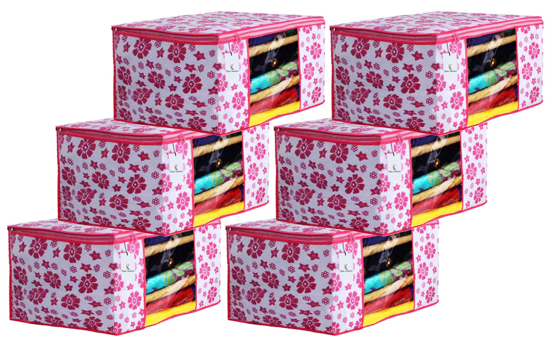 Material: Non Woven, Color: Pink. Design- Flower. Package Contents: 6 Piece Saree Cover . Size: 43 cm x 35 cm x 22 cm. Made from durable, wear and tear-resistant non-woven fabric. Lightweight and flexible saree covers. Carefully stitched to offer additional strength. Ideal for storing sarees and protecting them from dust and insects . Transparent see-through window for easy identification of contents. Durable zipper for easy opening and closing.Detailed Specifications: