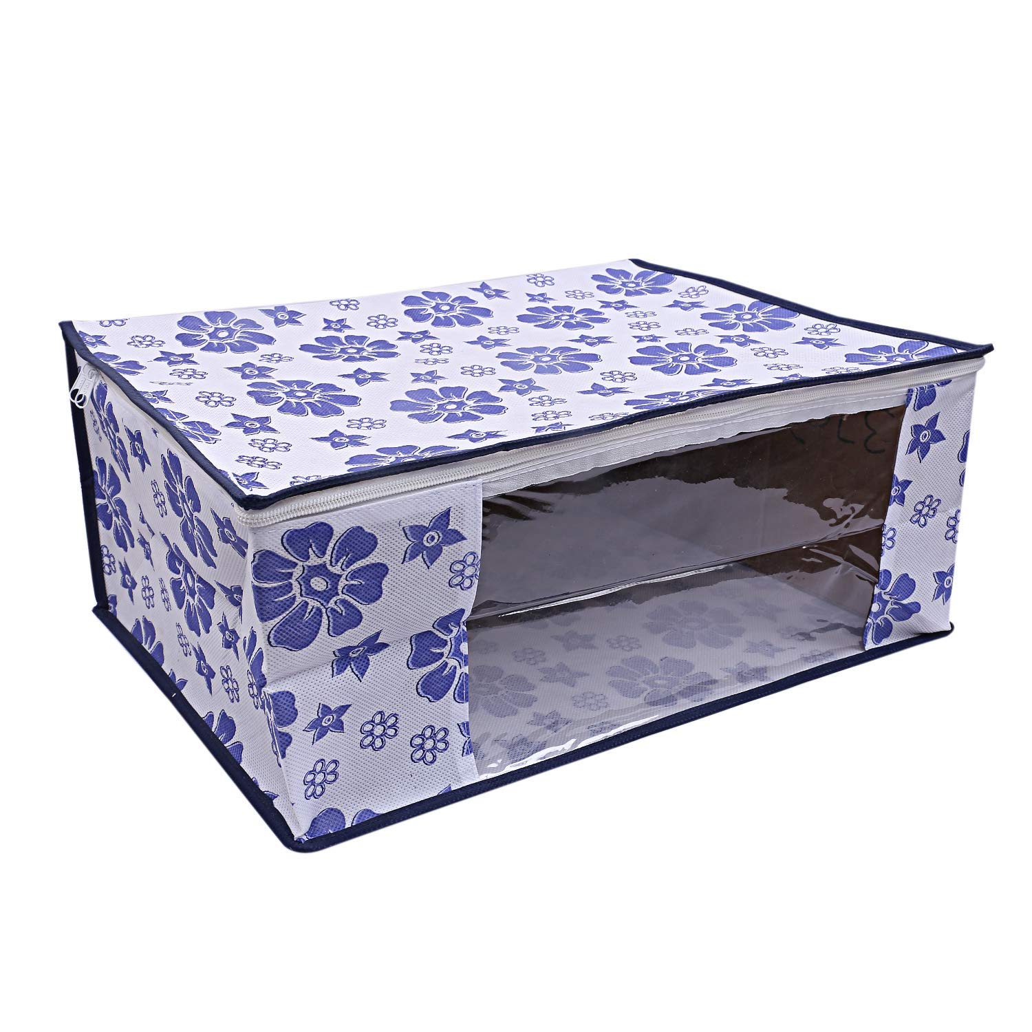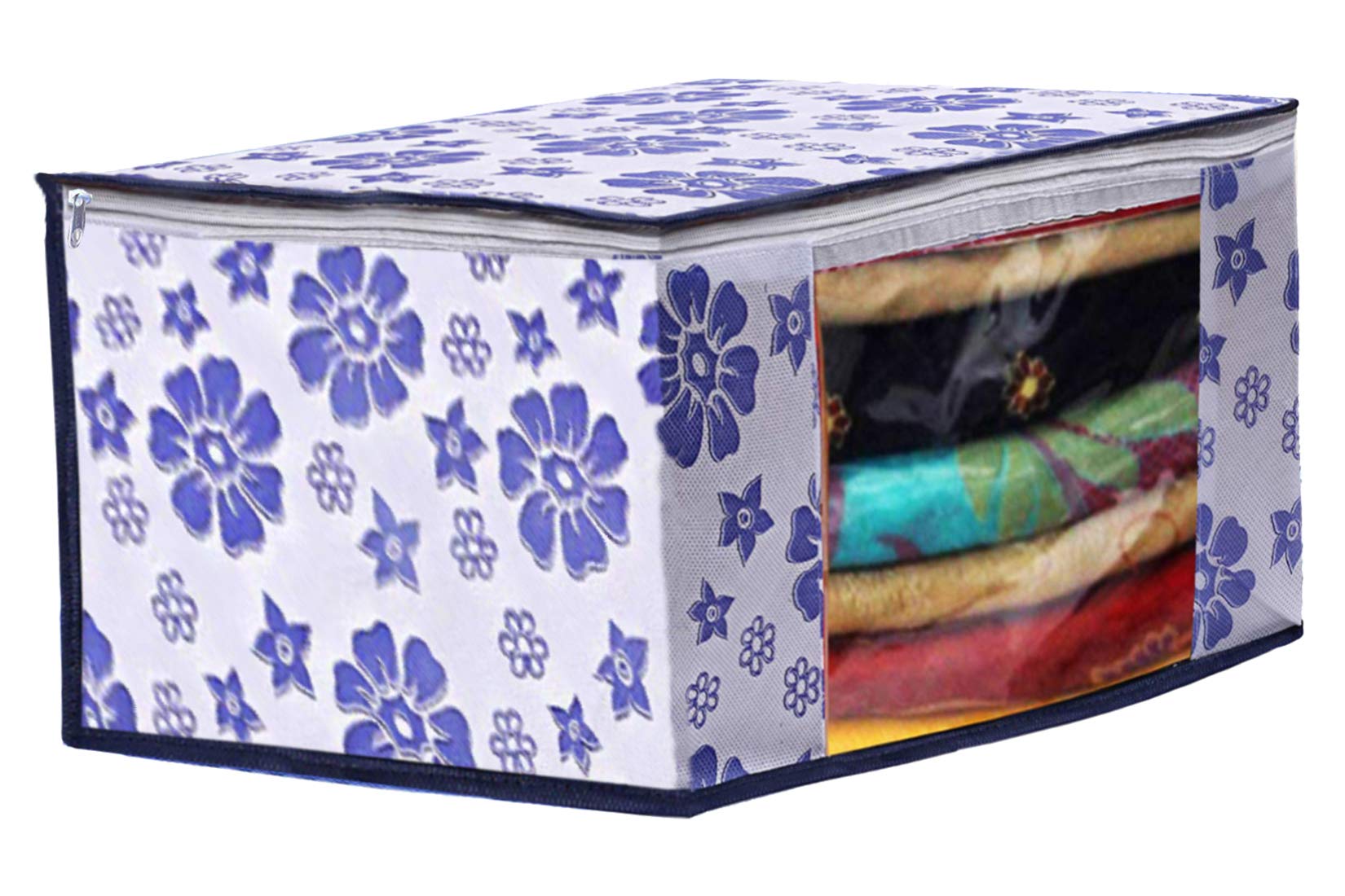 Material: Non Woven, Color: Royal Blue. Design- Flower. Package Contents: 6 Piece Saree Cover . Size: 43 cm x 35 cm x 22 cm. Made from durable, wear and tear-resistant non-woven fabric. Lightweight and flexible saree covers. Carefully stitched to offer additional strength. Ideal for storing sarees and protecting them from dust and insects . Transparent see-through window for easy identification of contents. Durable zipper for easy opening and closing.Detailed Specifications: