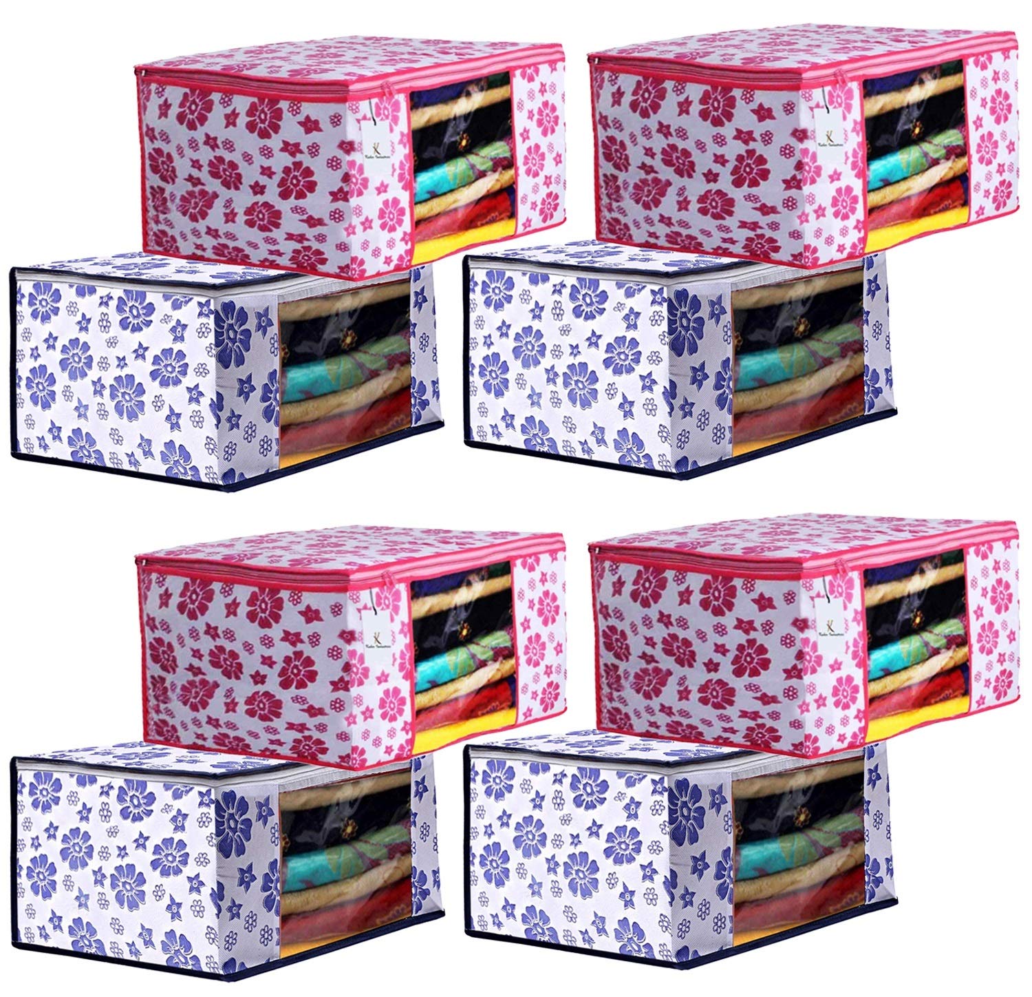 Material: Non Woven, Color: Pink & Blue. Design- Flower.Package Contents: 8 Piece Saree Cover.Size: 43 cm x 35 cm x 22 cm.Made from durable, wear and tear-resistant non-woven fabric. Lightweight and flexible saree covers.Carefully stitched to offer additional strength. Ideal for storing sarees and protecting them from dust and insects.Transparent see-through window for easy identification of contents. Durable zipper for easy opening and closing.Detailed Specifications: