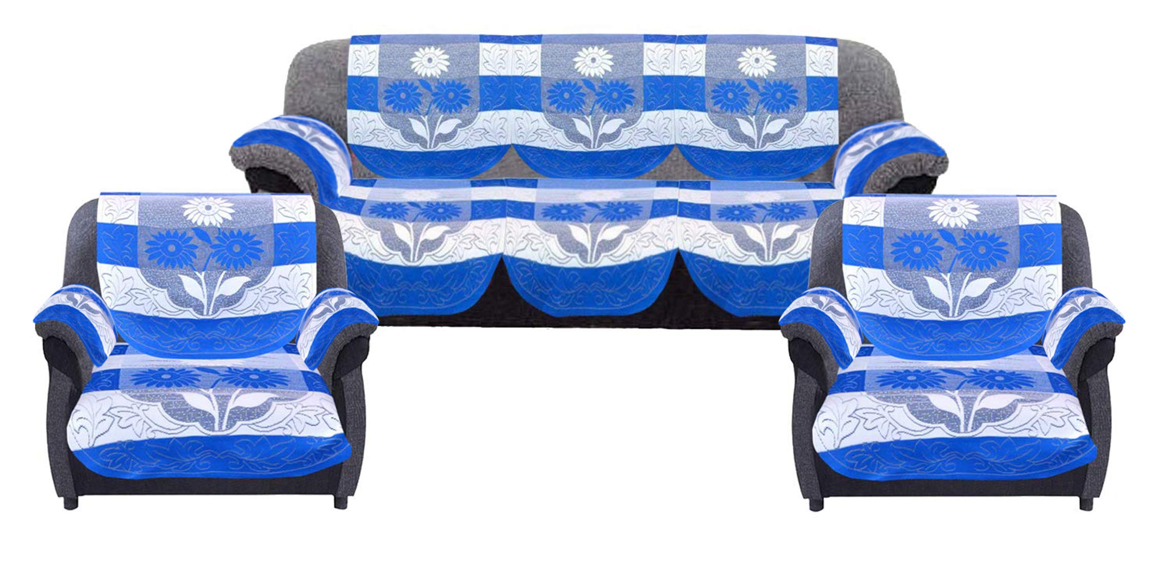 1 long back cover for 3 seater sofa, 1 long seat cover for 3 seater sofa, 2 back covers and 2 seat cover for single seat sofa And 1 Center Table Cover. Made in Velvet material. Protect: Our stylish furniture slip cover protects furniture from stains, dust, dirt and pet hair. Great for homes, offices with babies, kids, dogs and cats. Perfect fit: Fits perfectly on each and every kind of sofa, made from quality material. Easy care: Machine wash and hand washable (cold) and dry (cool). Dimensions in cm (lxw): Sofa seat cover- 178x74, sofa back cover- 178x74, chair seat cover- 74x61, chair back cover- 74x61,.Detailed Specifications: