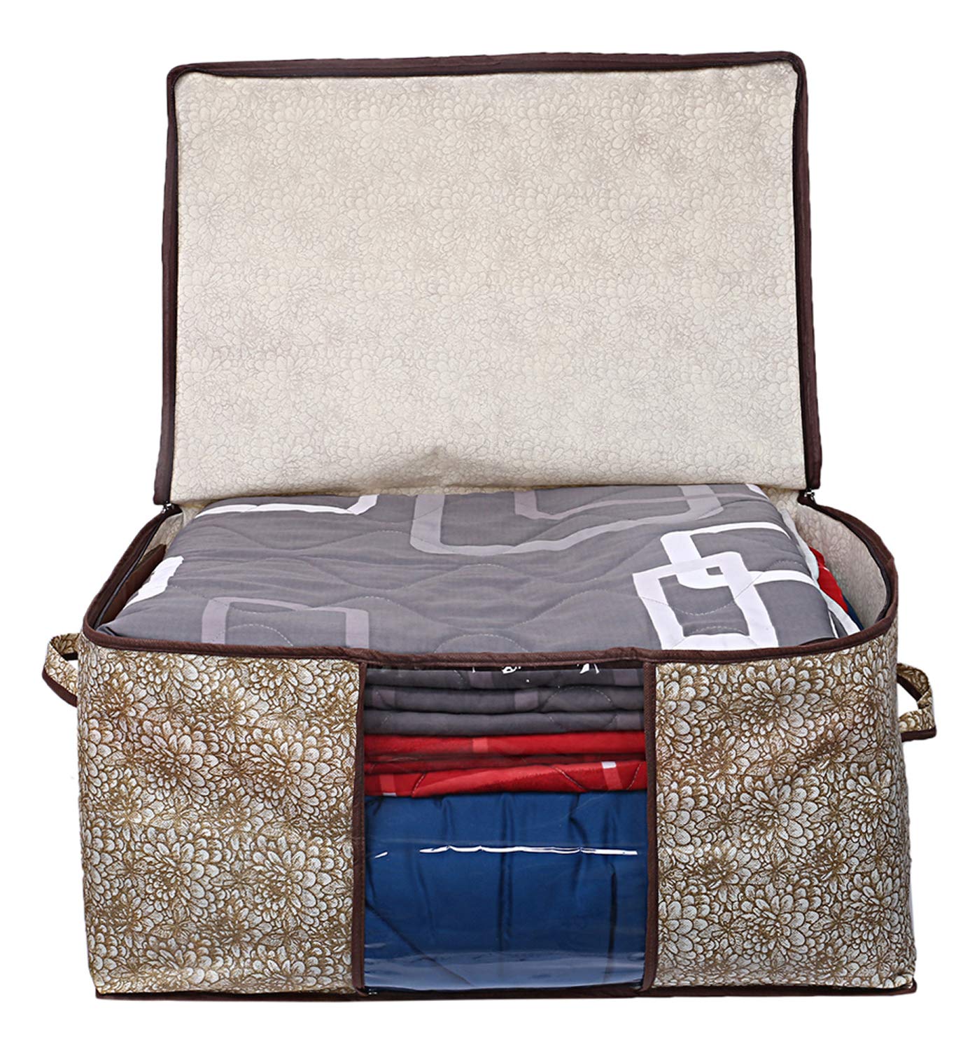 Folding, durable and non woven fabric, easy storage fabric sweater clothes blanket storage bag suitable for storing clothes, blankets, sweater, quilts, coats and other. Easy to organize all your stuff and take out your clothes from mildew, dust, moisture, insects, anti-discoloration as they are well stored. Material - non woven fabric, colour - golden brown, dimensions - 65 x 47 x 33 cm. Design- plain. Package contents: 5 underbed storage bag. Carefully stitched to offer additional strength. Transparent see-through window for easy identification of contents.