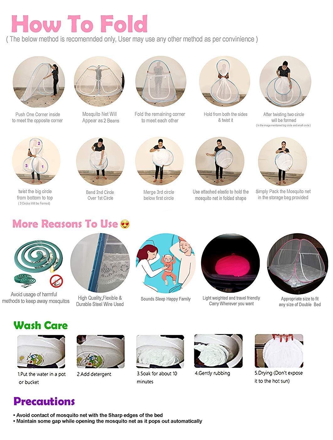 |        Available in Different Sizes King Size ,Queen Size, Super King Size, Single Bed Accommodate 2 adults & 1 Kid in double Bed 2 side Door In Double Bed 1 Side Door In Signle Bed Zip can be Opened Both Side Hassle free entry and exit  |             Easy to open and setup Self supported, requires no support Easy To Fold Can be folded in very less time Can be stored in small bag Easy to carry to everywhere  |             Terelyne Material Mesh Size Designed For optimum Air Circulation Tiny holes to keep away mosquitoes Strong mesh fabric  |