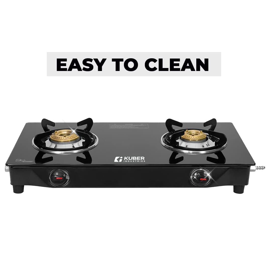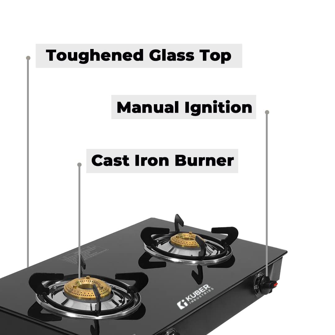 Cast Iron BurnerThe burner is made of cast iron which provides stable heat radiation, allowing for more uniform cooking. | Manual IgnitionKuber Industries’ gas stoves come with manual ignition knobs, which are easy to twist and use, making it an enjoyable cooking experience for you and your family. | Dark Tone BodyThese gas stoves have been designed with toughened glass tops and dark tone body. |