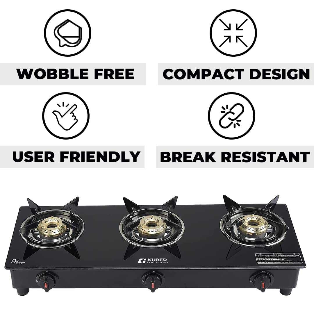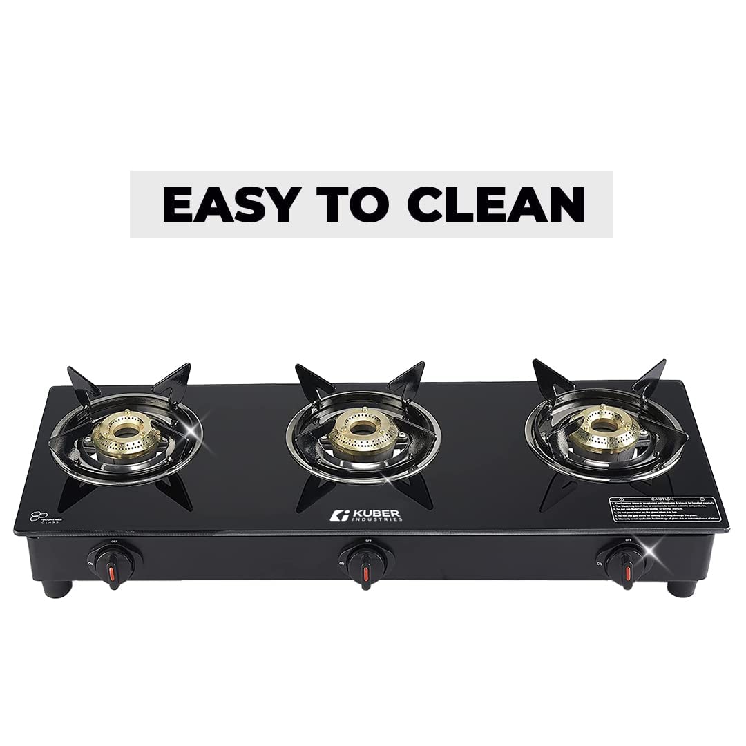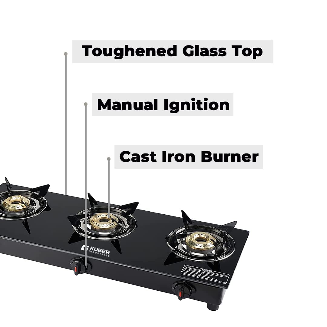 Cast Iron BurnerThe burner is made of cast iron which provides stable heat radiation, allowing for more uniform cooking. | Manual IgnitionKuber Industries’ gas stoves come with manual ignition knobs, which are easy to twist and use, making it an enjoyable cooking experience for you and your family. | Dark Tone BodyThese gas stoves have been designed with toughened glass tops and dark tone body. |