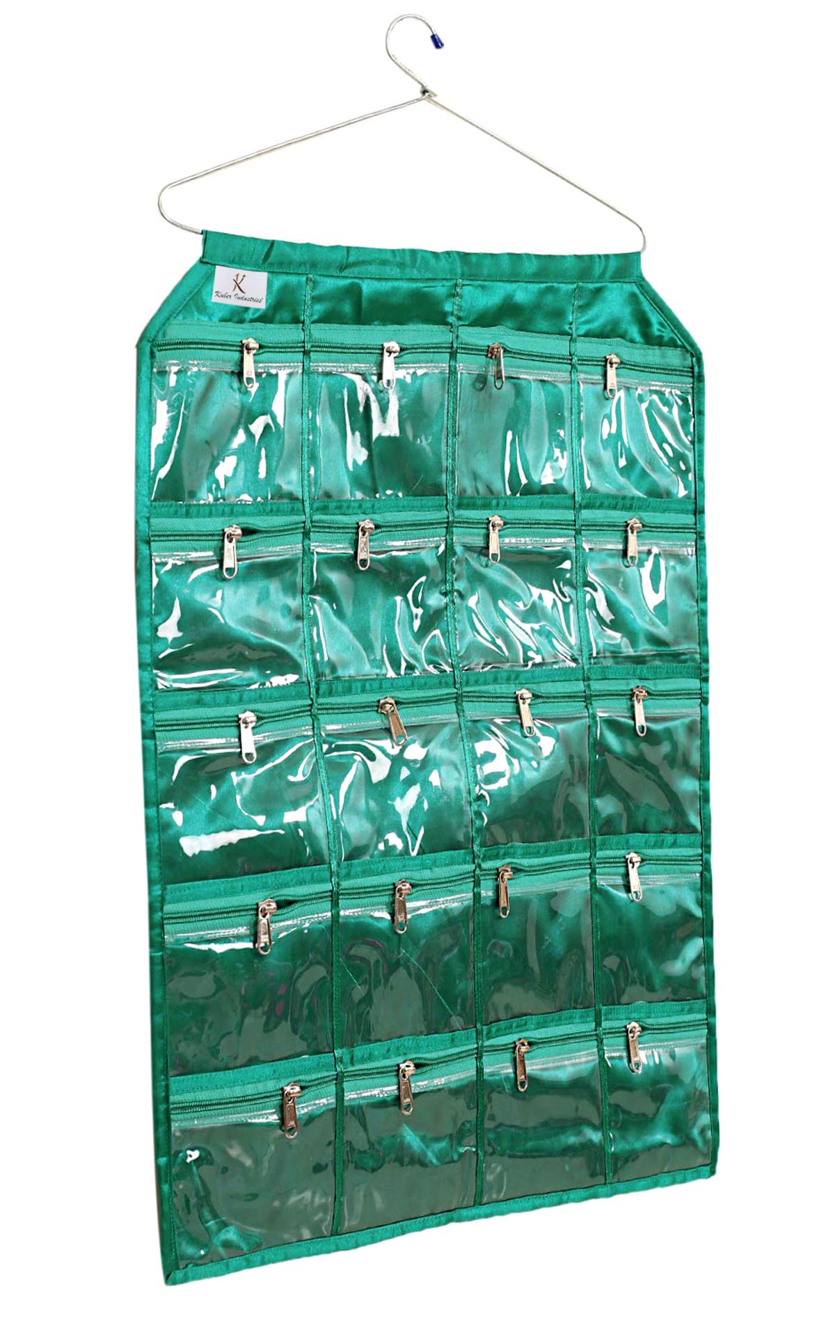 Material:Made of satin and clear PVC window. Organizer for Earrings,Pendants,Necklace,Bracelet, Ring, Watches,Chains,Pearl Jewellery,Accessory,Head rope,Headband or nail polish, cuffs, makeup brushes, Eye shadow etc. Transparent PVC window:easily view and protect items,endurable and good-looking,The hanging bag display Jewellery well and opening pockets for convenient to pick something to wear with an outfit, takes up just as much space as a Jacket hanging in the closet . Easy to Pick: No need to took the Jewellery out for selection; it's clear enough that you can easily look and guess through,The hanging bag With a hanger is convenient to put it anywhere, it can rolls up for easy carry, perfect for travel,Convenient to carry your Jewellery ! Comes with 20 Pocket: No need to put everything altogether and then scatter them throughout the room in the quest to find the little rings or earrings. You can put them in separate transparent pockets and select the one as they are visible.Kuber Industries is a customer-loved brand that brings you everything you need to make a house a home. Right from nifty storage solutions to smart kitchen essentials, our products are known for their premium and durable quality.