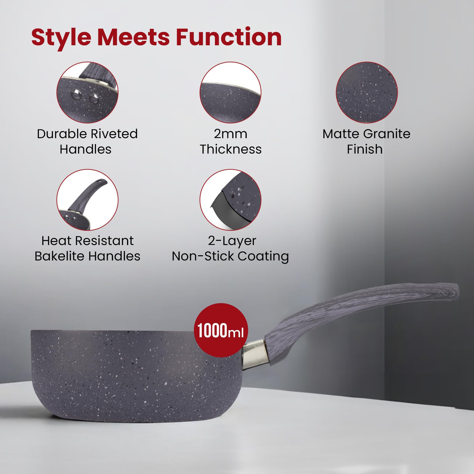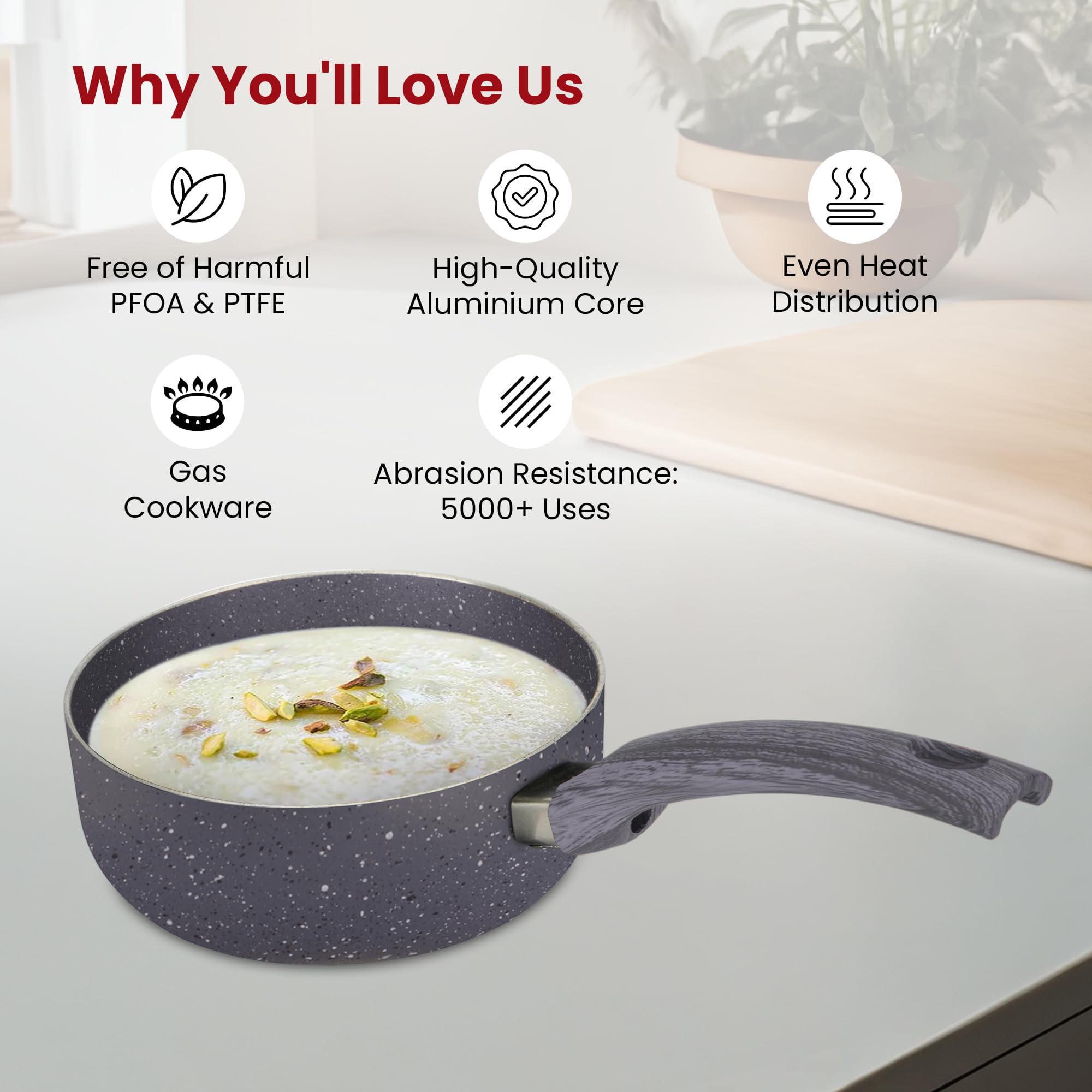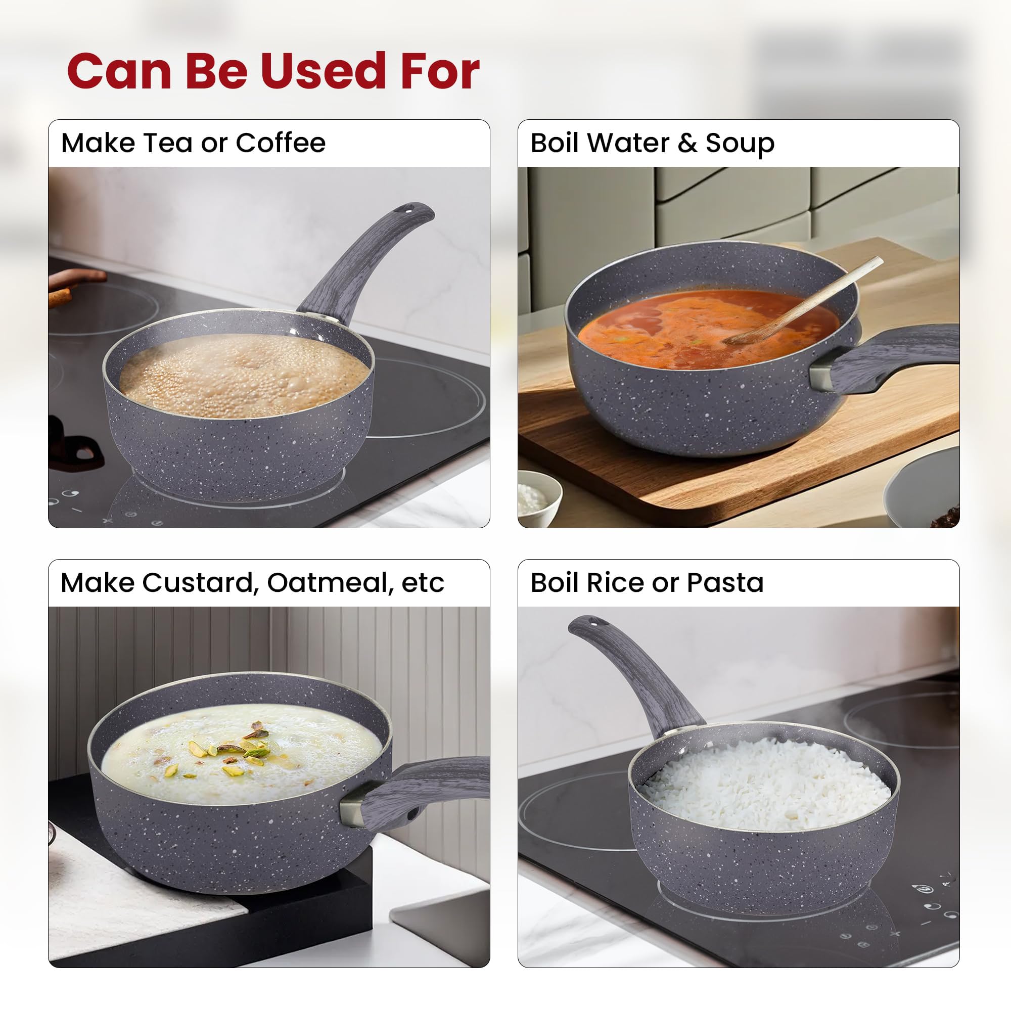 This sauce pan is designed to make your tea, coffee, or milk preparation simple because it is hard anodised and non-stick, which helps with easy cleaning. Our pan includes a heat-resistant handle, so you can safely use it on both gas stoves and induction cooktops without worry. It is made to last because the tough material ensures it can handle everyday use. This is a multipurpose kitchen tool that you can use for multiple cooking needs whenever you need it. We made sure this pan is lightweight so you can use it comfortably without any inconvenience.Detailed Specifications:
