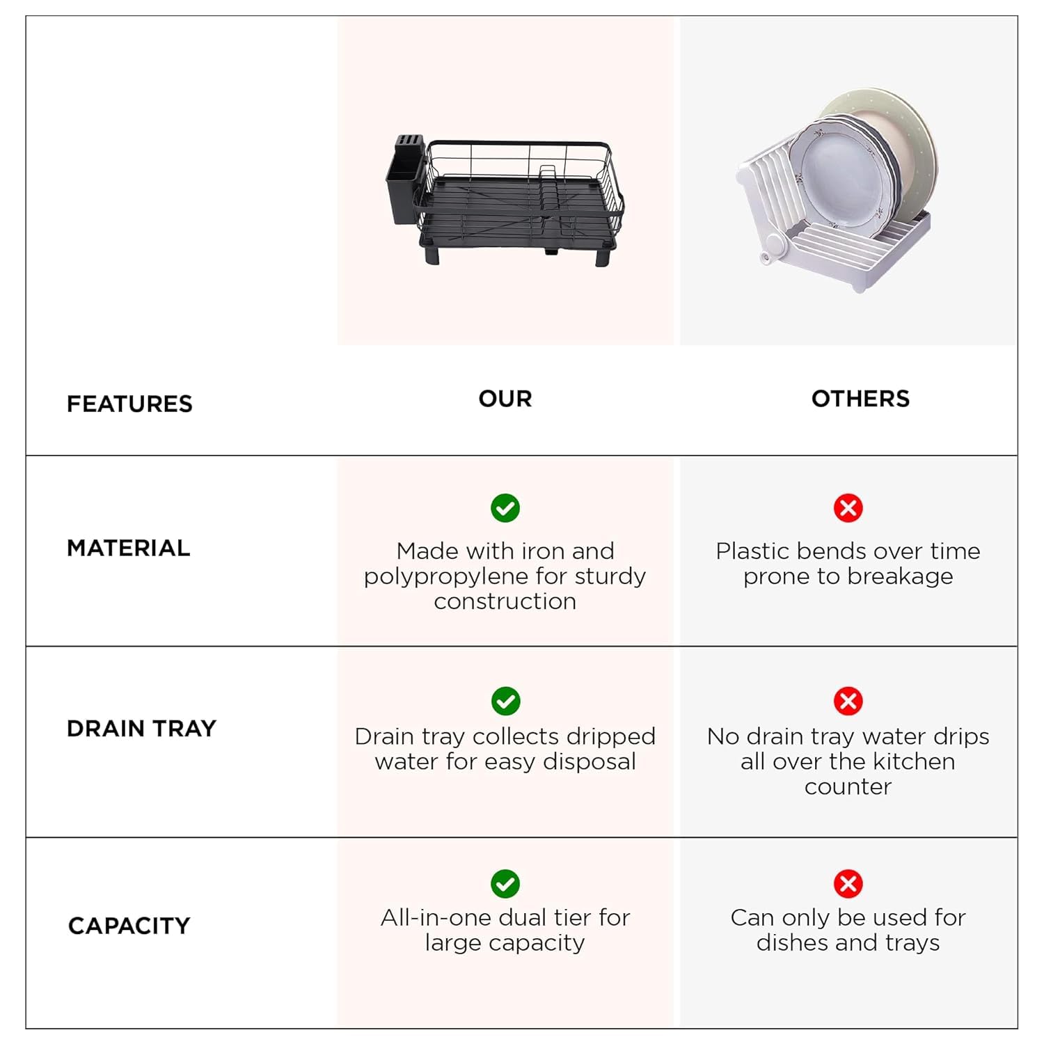 Introducing the Kuber Industries Iron Kitchen Rack, a must-have for any kitchen looking to optimize space and keep things organized. This modern and stylish dish drying rack is the perfect solution for large families, providing ample storage for dishes, bowls, cups, cutlery, and utensils. Crafted with durable iron wire coating, this multipurpose kitchen stand is built to last. The PP utensil holder and drain tray ensure convenience in use, with a conduit in the tray for easy water drainage into the sink. The open size of 48.5*32.5*33cm and folded size of 43*32.5*13cm make this a compact and space-saving organizer. The Kuber Industries Iron Kitchen Rack features a stable structure and is easy to assemble, offering a large capacity for all your kitchen essentials. With its black powder-coated finish, this dish drying rack adds a touch of elegance to any kitchen. Designed with the customer in mind, this dish drainer basket for the kitchen addresses concerns about quality, stability, and size.Detailed Specifications: