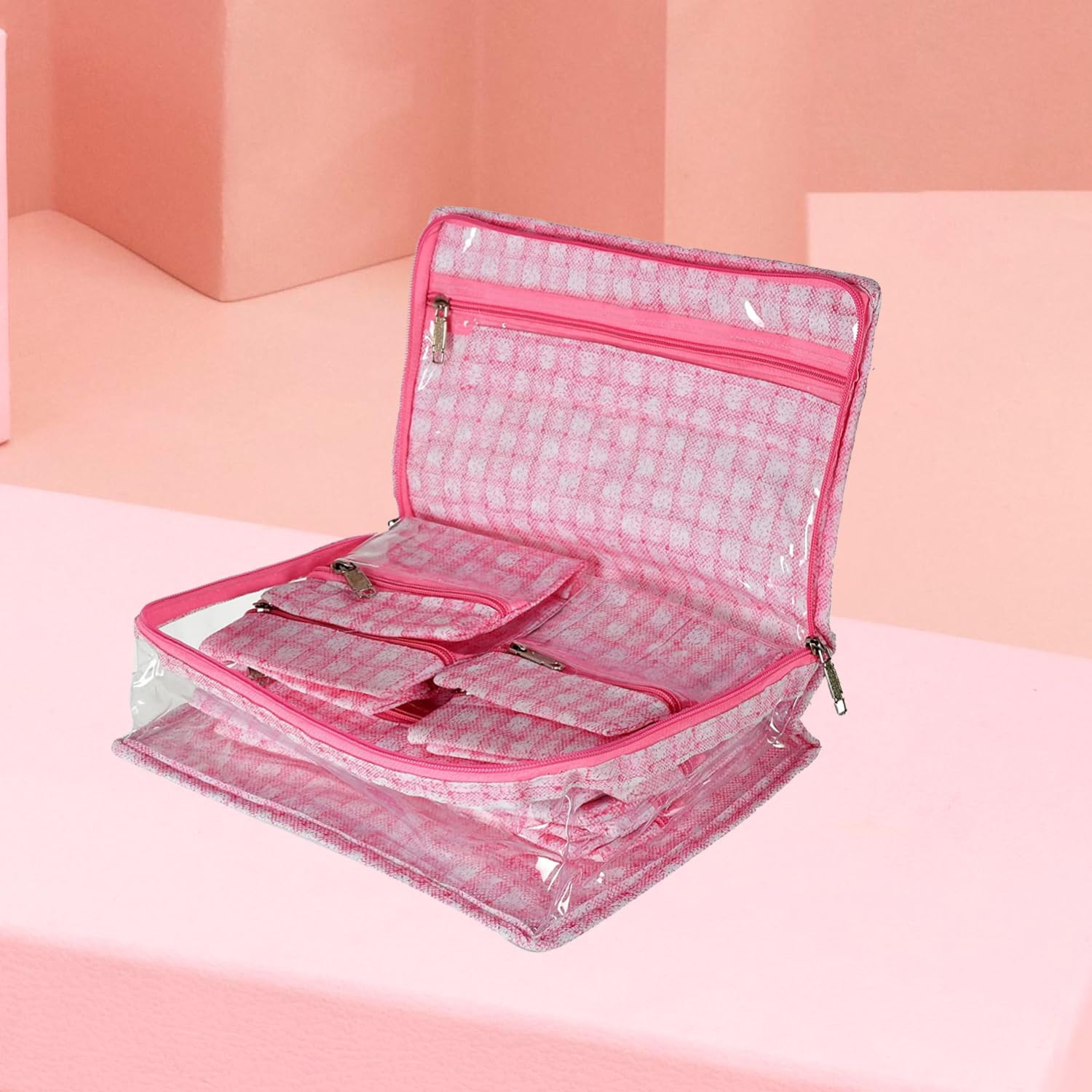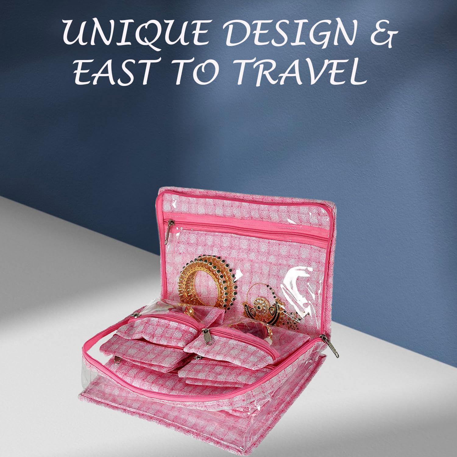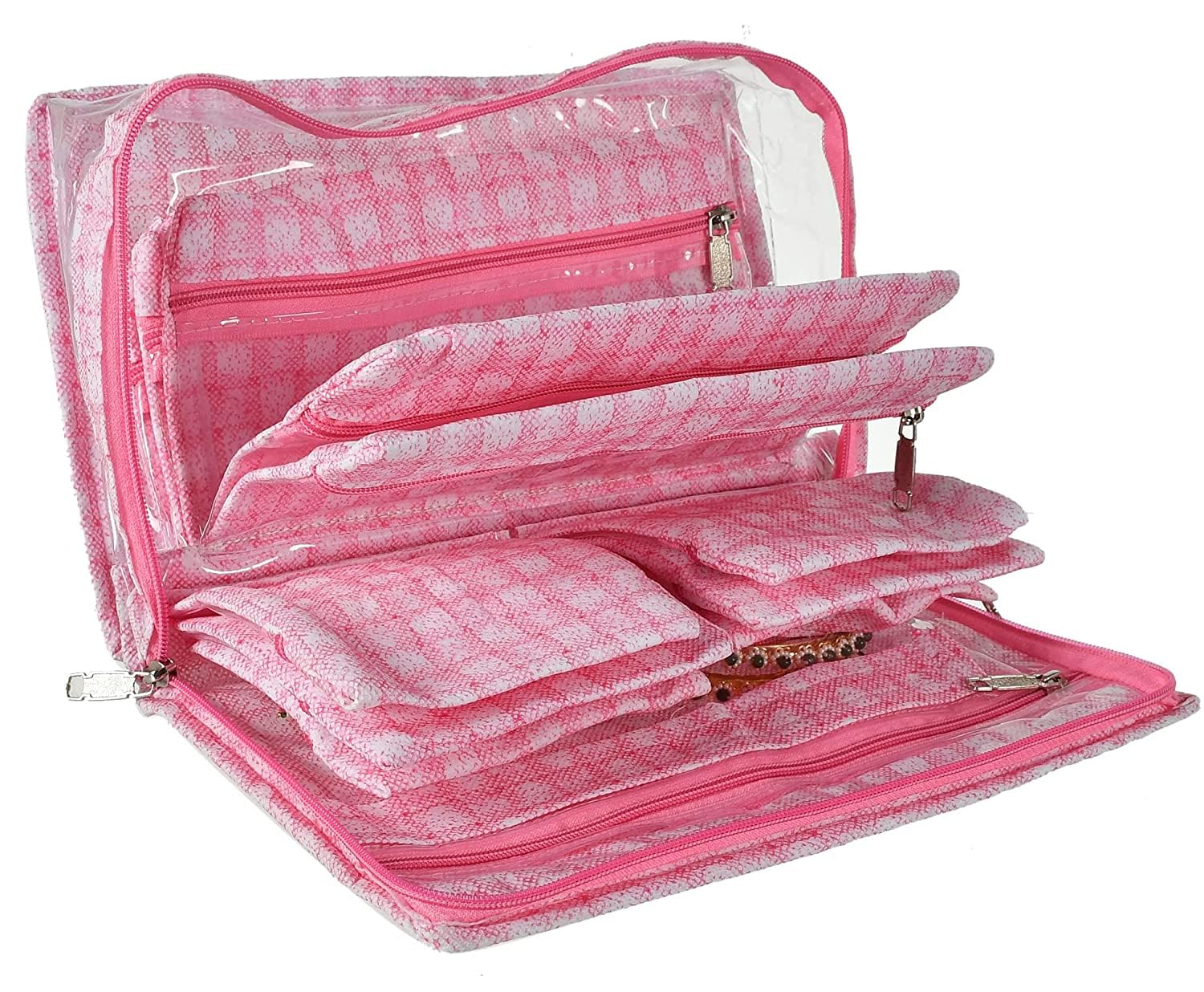 Heart Home is a Popular Brand that offers a wide range of home and Kitchen Products and an Extensive Collection of Products, keeping this in mind, we Present to you PVC Laminated Jewellery Kit, This Jewellery kit is Adorned with check design This is your ideal Jewellery kit an easy way to keep your Precious Jewellery Organized with 5 Transparent Pouches and an extra Single Bangle roll. Would be a Great Occasion as a Gift to your wife, mother or at any wedding ceremony.Detailed Specifications: