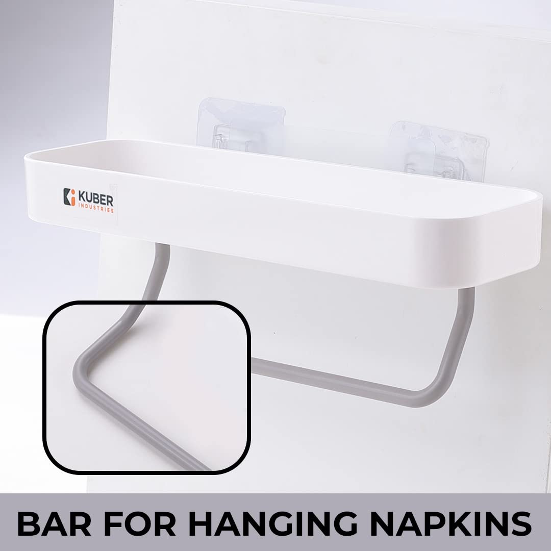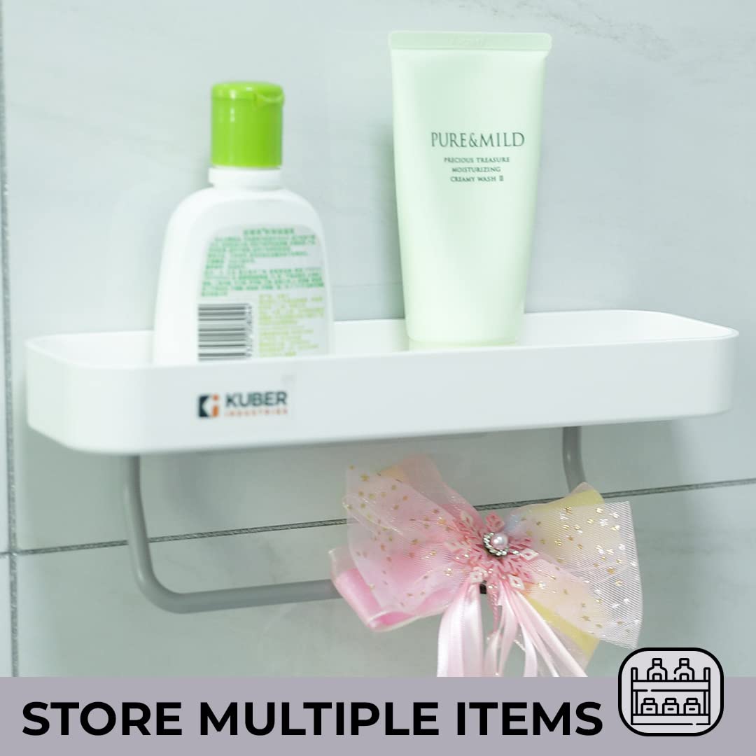 Kuber Industries is Delighted to Present a wide range of storage shelves and racks to help organize your kitchen and bathroom easily! This premium bathroom & kitchen organized is amde of premium quality ABS & PVC plastic, which is both durable & non-toxic. It also come switch a sturdy towel hanger bar for added convenience. The strong self-adhesive feature makes this bathroom shelf easy to install, while causing no damage to your walls! The compact size of this kitchen rack, further allows you o store multiple items while using minimal space, adding to its utilitarian value. A multi-purpose wall mounted shelf, it can easily serve as a kitchen sink organizer, keeping your dishwashing essentials clean and dry, while allowing your napkin and hand towels to hang freely! On the other hand, you can just a seasily use it as shower caddy, keeping your body wash, loofah, and othe toiletries organised neatly at an arm’s rea ach! The beautiful warm white colour allows it to add to the neatness of your spaces, while adding utilitarian value with ease! A compact and lightweight storage solution that will reduce the clutter in your home and help you arrange all your cleaning essentials in one place, the additional tower hanger ensures that you can maintain the perfect hand hygiene and avoid wet clammy hands. The wall shelf can be used to keep all your skincare products in one place and avoid clutter.