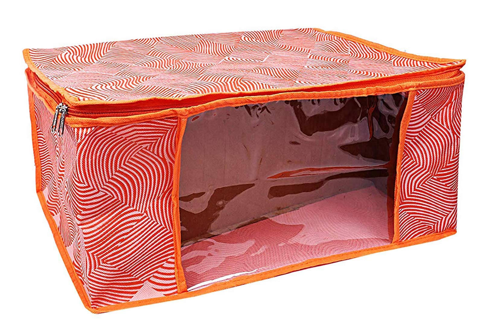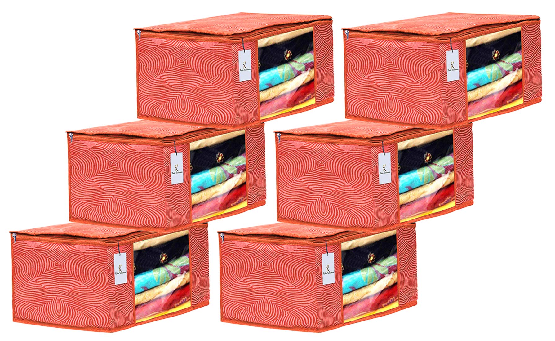 Material: Non Woven, Color: Orange. Design- Laheriya. Package Contents: 6 Piece Saree Cover . Size: 43 cm x 35 cm x 22 cm. Made from durable, wear and tear-resistant non-woven fabric. Lightweight and flexible saree covers. Carefully stitched to offer additional strength. Ideal for storing sarees and protecting them from dust and insects . Transparent see-through window for easy identification of contents. Durable zipper for easy opening and closing.Kuber Industries is a customer-loved brand that brings you everything you need to make a house a home. Right from nifty storage solutions to smart kitchen essentials, our products are known for their premium and durable quality.