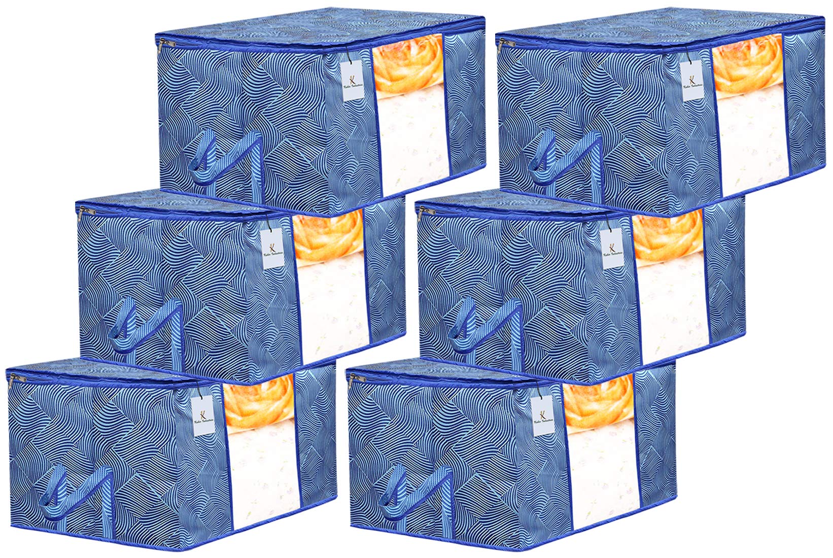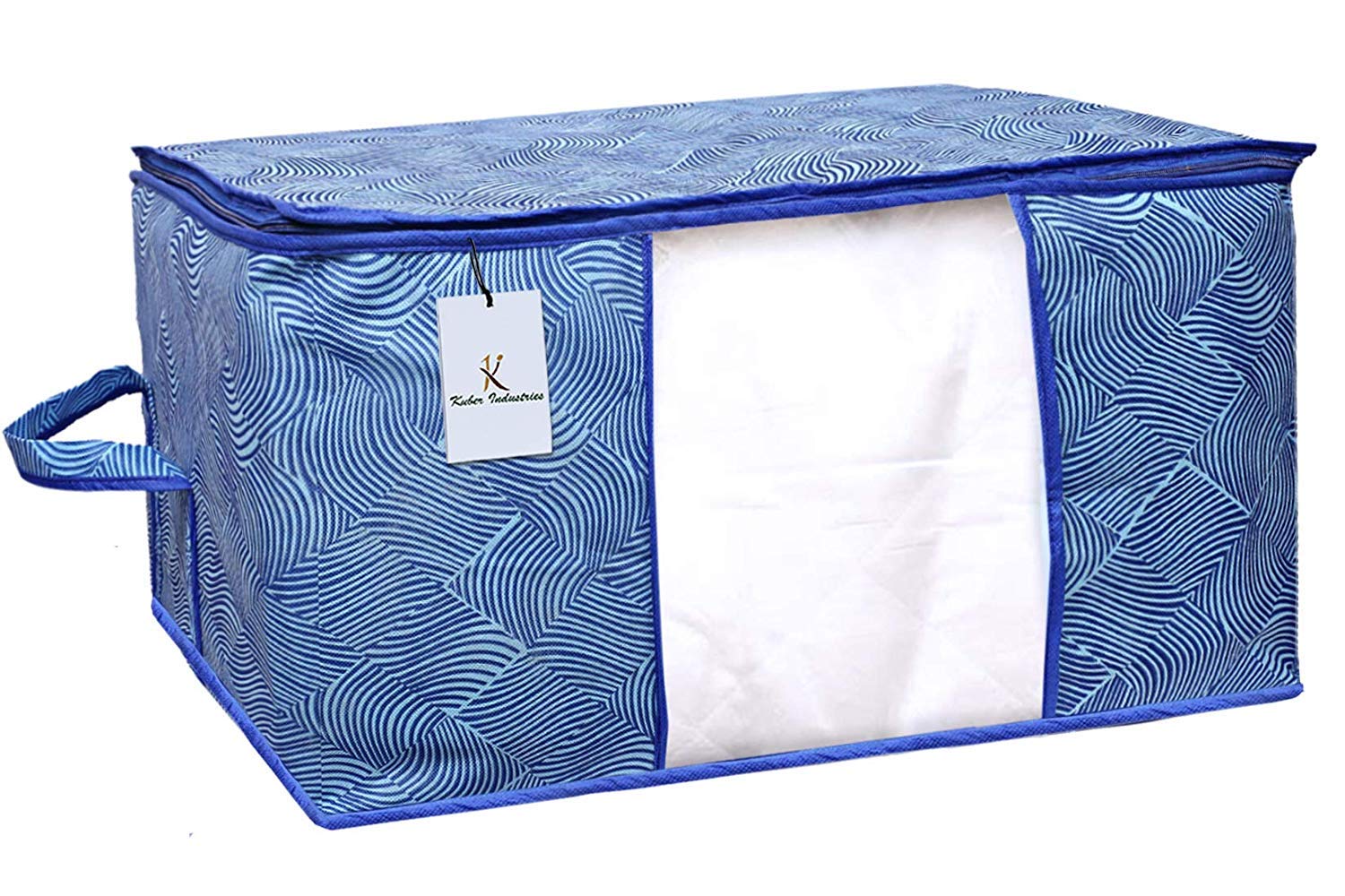 Package Contents: 6 Piece Underbed Storage Bag, Material: Non Woven, Color: Blue. Design- Laheriya, Size: 65 cm x 47 cm x 34 cm, Made from durable, wear and tear-resistant non-woven fabric. Lightweight and flexible organiser fits under multiple beds, Carefully stitched to offer additional strength. Size of each bag: 65 cm x 47 cm x 34 cm,Transparent see-through window for easy identification of contents. Durable zipper for easy opening and closing, Under bed storage bags for dust, dirt and pest-free storage. Attached handles for convenient pulling and lifting.Kuber Industries is a customer-loved brand that brings you everything you need to make a house a home. Right from nifty storage solutions to smart kitchen essentials, our products are known for their premium and durable quality.