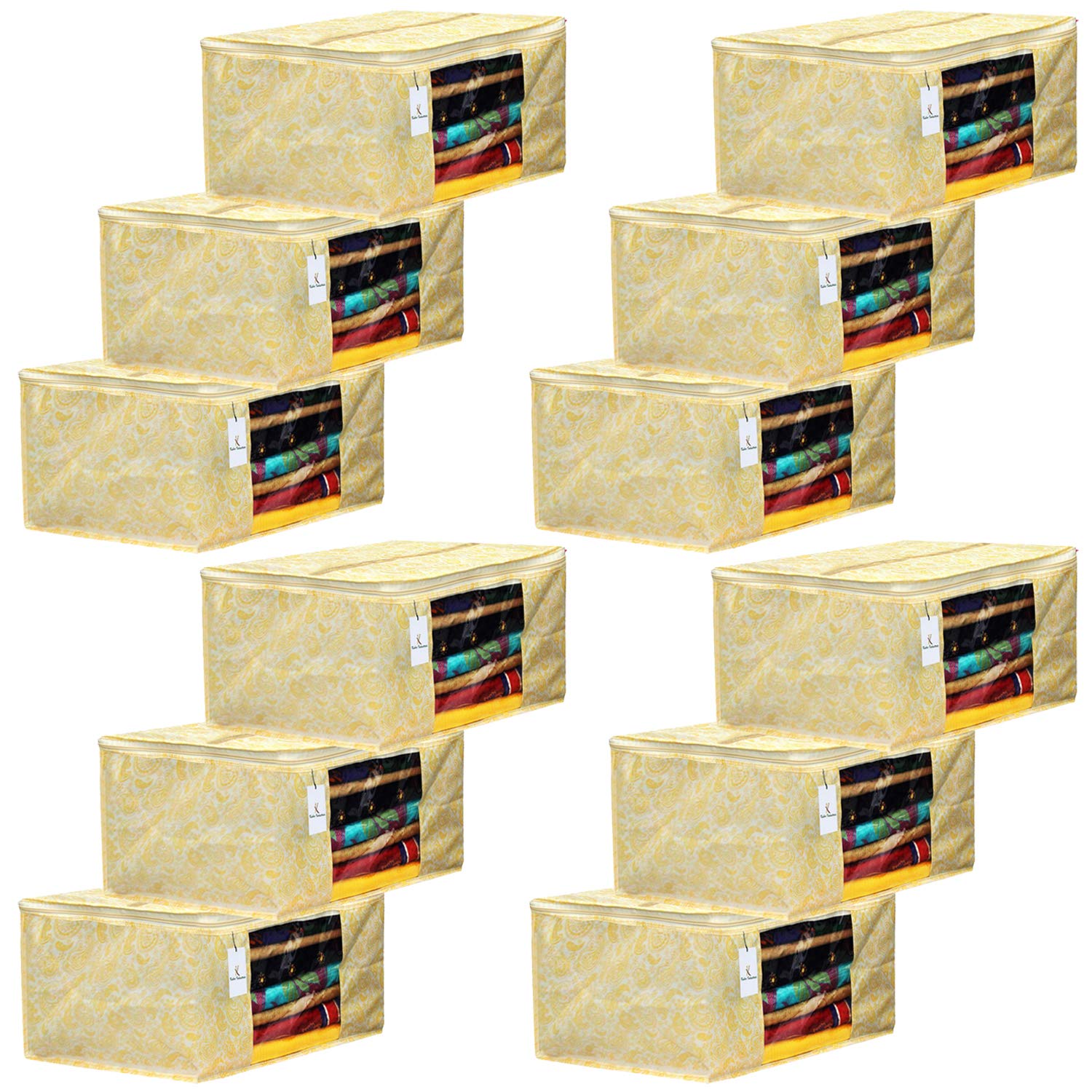 Material: Non Woven, Color: Gold. Design- Leaf. Package Contents: 6 Piece Saree Cover . Size: 43 cm x 35 cm x 22 cm. Made from durable, wear and tear-resistant non-woven fabric. Lightweight and flexible saree covers. Carefully stitched to offer additional strength. Ideal for storing sarees and protecting them from dust and insects . Transparent see-through window for easy identification of contents. Durable zipper for easy opening and closingDetailed Specifications: