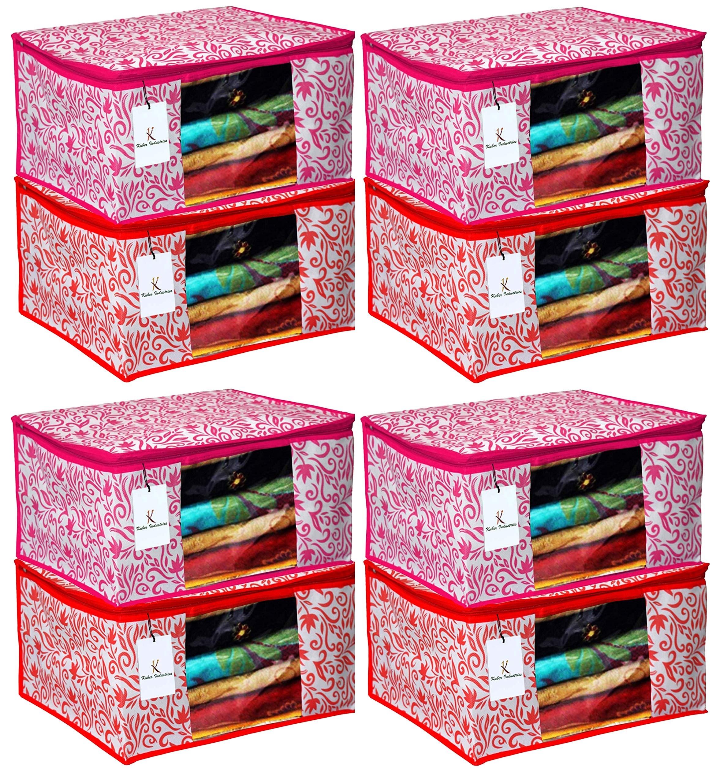 Material: Non Woven, Color: Red & Pink. Design- Leaf .Package Contents: 8 Piece Saree Cover .Size: 43 cm x 35 cm x 22 cm .Made from durable, wear and tear-resistant non-woven fabric. Lightweight and flexible saree covers .Carefully stitched to offer additional strength. Ideal for storing sarees and protecting them from dust and insects .Transparent see-through window for easy identification of contents. Durable zipper for easy opening and closing.Detailed Specifications:
