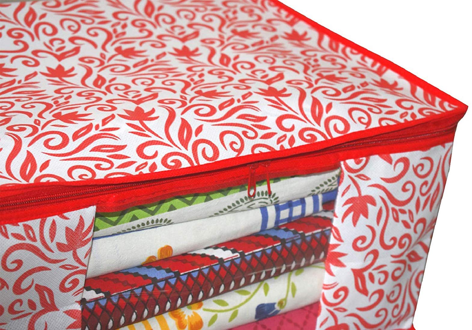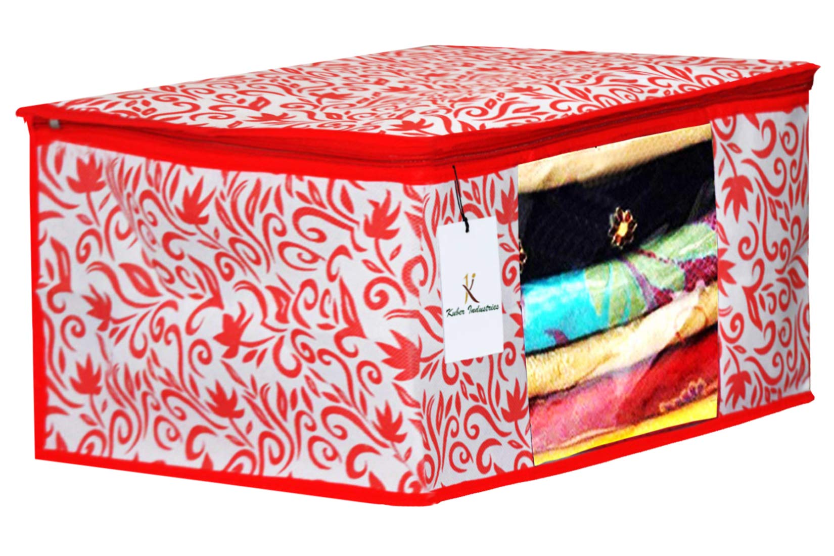 Material: Non Woven, Color: Red. Design- Leaf. Package Contents: 9 Piece Saree Cover. Size: 43 cm x 35 cm x 22 cm. Made from durable, wear and tear-resistant non-woven fabric. Lightweight and flexible saree covers. Carefully stitched to offer additional strength. Ideal for storing sarees and protecting them from dust and insects. Transparent see-through window for easy identification of contents. Durable zipper for easy opening and closing.Detailed Specifications: