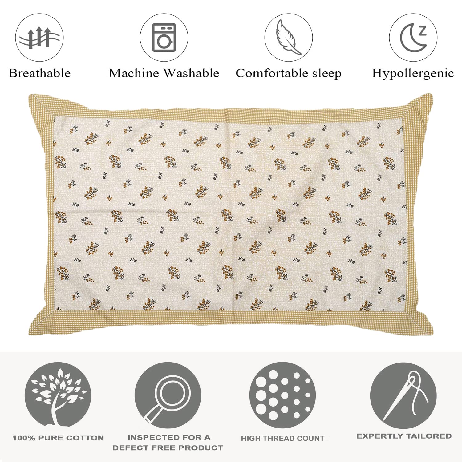 FINEST COTTONOur Pillow cover are made from the finest cotton to ensure softness, breath ability and wrinkle resistance. This enhances the look of the product and makes them appear more luxuriously soft, silky smooth feel, giving you the best, most refreshing night's sleep and enables the pillow covers to blend in with the decor of your home. | ELEGANT PRINTS AND DESIGNSOur Pillow cover fit perfectly for Standard size pillows. The exquisite pillow covers will become an integral part of your decor, only when you wrap it around with a contrasting pillow. Our pillow cover lights up your room's beauty which brings opulence and additional comfort to your living. A good night's sleep starts with soft, cozy pillow that let your body breathe. | MACHINE WASHABLEOur covers need a normal hand or machine wash with a gentle detergent. Machine washable and dry able, Wash in cold water, Tumble dry low.Wash dark colors separately for the first few washes and follow wash care instructions for maintaining vibrant colors and longer life. |