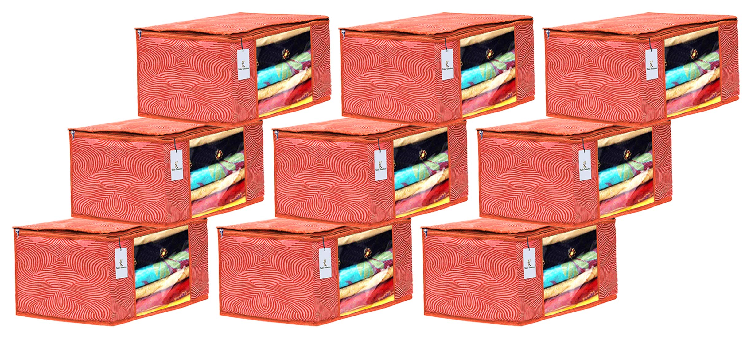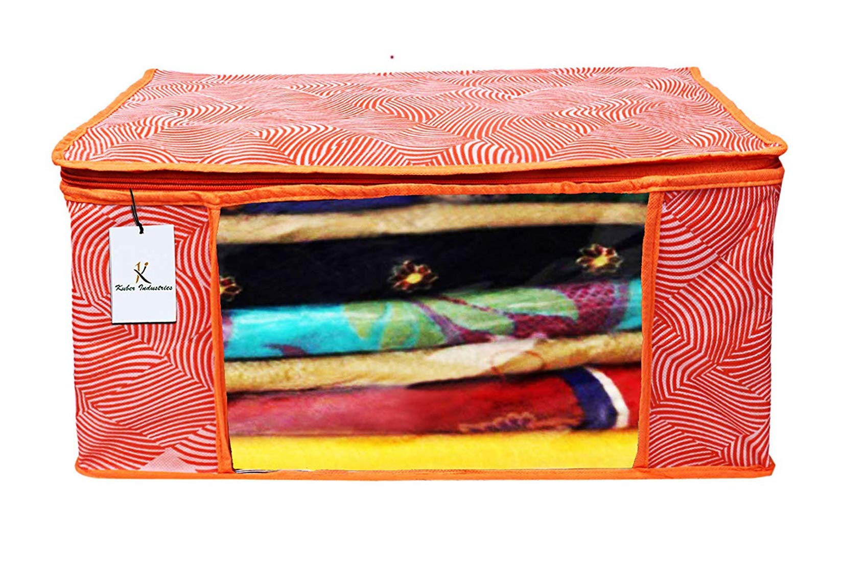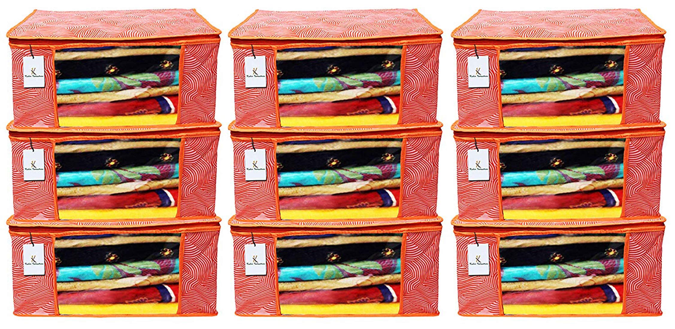 Made from durable, wear and tear-resistant non-woven fabric. Attractive colour and design. Can keep upto - 10 to 15 sarees. Lightweight and flexible saree covers. Carefully stitched to offer additional strength. Transparent see-through window for easy identification of contents. Durable zipper for easy opening and closing. Long life high quality saree cover bag for organizing your costly and favourite sarees. Package contents: 9 pieces saree covers. Colour- orange, leheriya design . Made from durable, wear and tear-resistant non-woven fabric. Can keep upto - 10 to 15 sarees. Lightweight and flexible saree covers. Carefully stitched to offer additional strength. Transparent see-through window for easy identification of contents. Durable zipper for easy opening and closing. Long life high quality saree cover bag for organizing your costly and favourite sarees.Detailed Specifications: