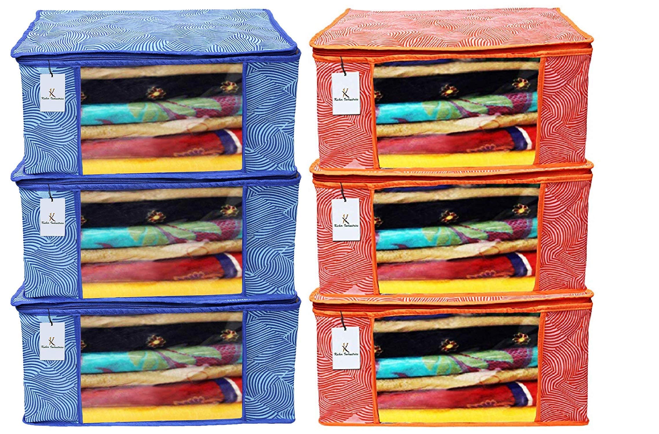 Material: Non Woven, Color: Orange & Blue. Design- Leheriya Printed .Package Contents: 6 Piece Saree Cover .Size: 43 cm x 35 cm x 22 cm .Made from durable, wear and tear-resistant non-woven fabric. Lightweight and flexible saree covers .Carefully stitched to offer additional strength. Ideal for storing sarees and protecting them from dust and insects .Transparent see-through window for easy identification of contents. Durable zipper for easy opening and closing.Detailed Specifications:
